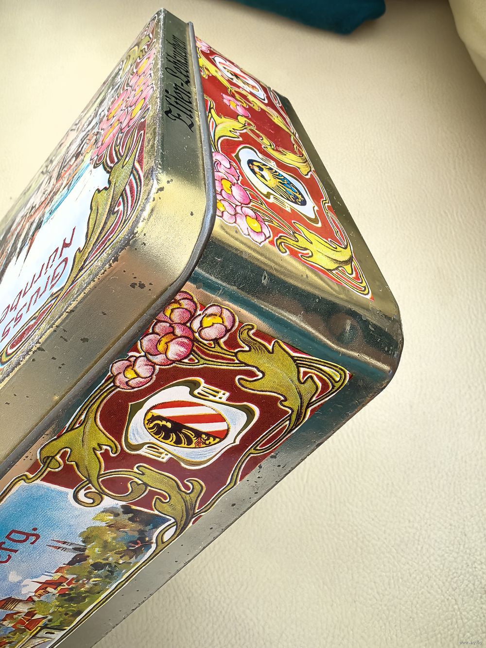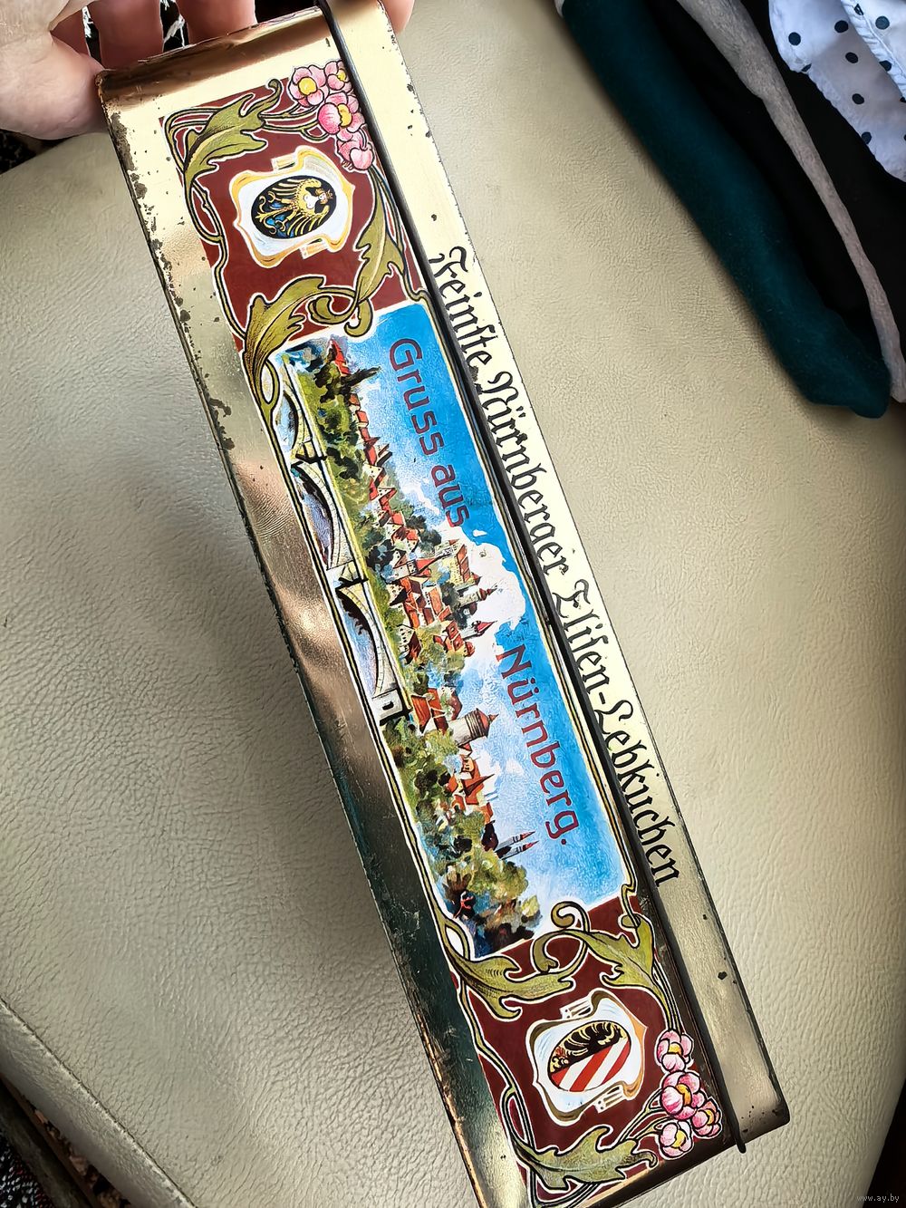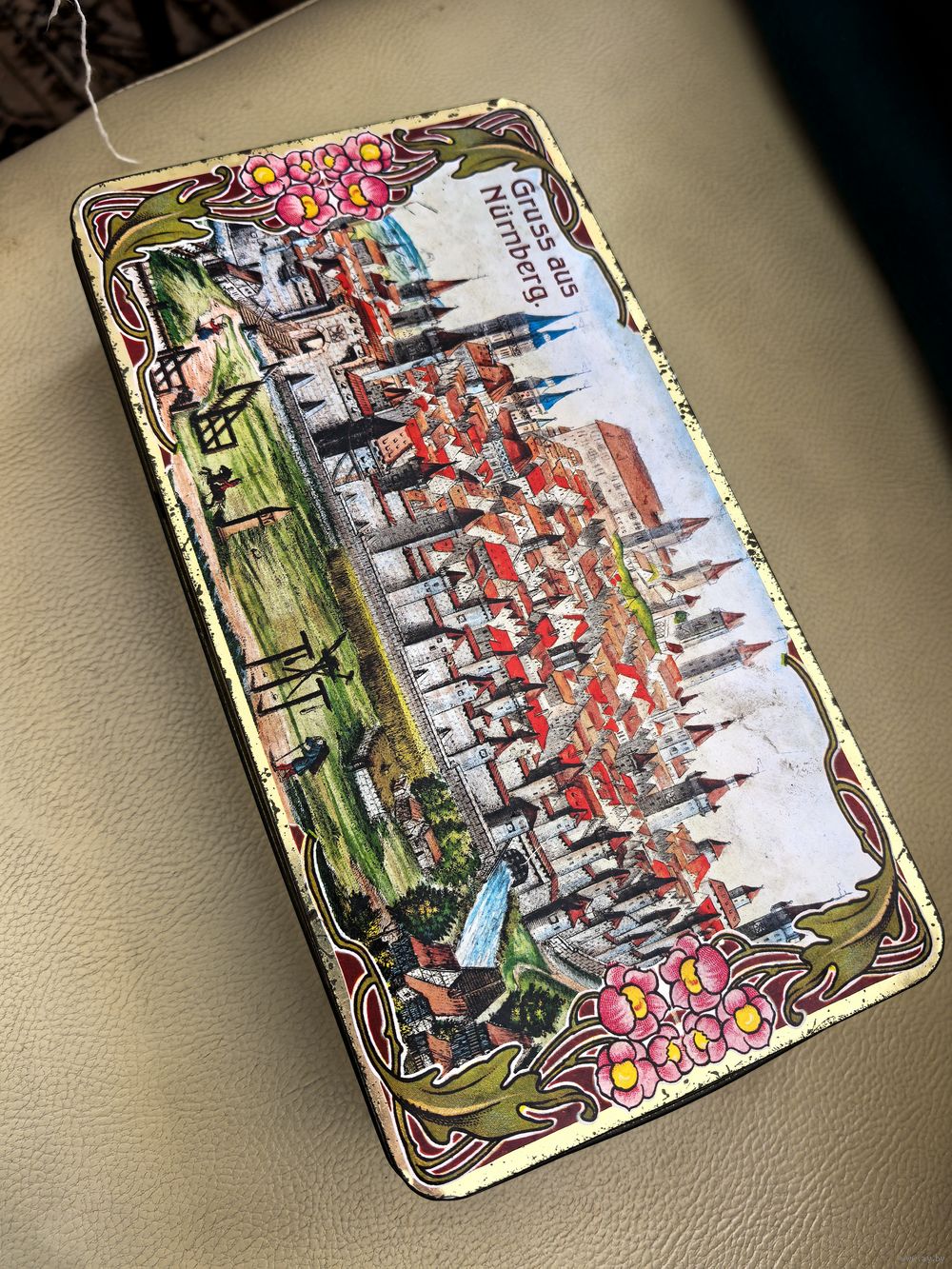 Винтажная жестяная коробка от традиционных немецких пряников Вайселла Элизен. Коробка выполнена в стиле старинных открыток начала ХХ века, с панорамным видом немецкого города Нюрнберг - исторический центр с его архитектурными элементами (мост через реку Пегниц, замки и башни).
