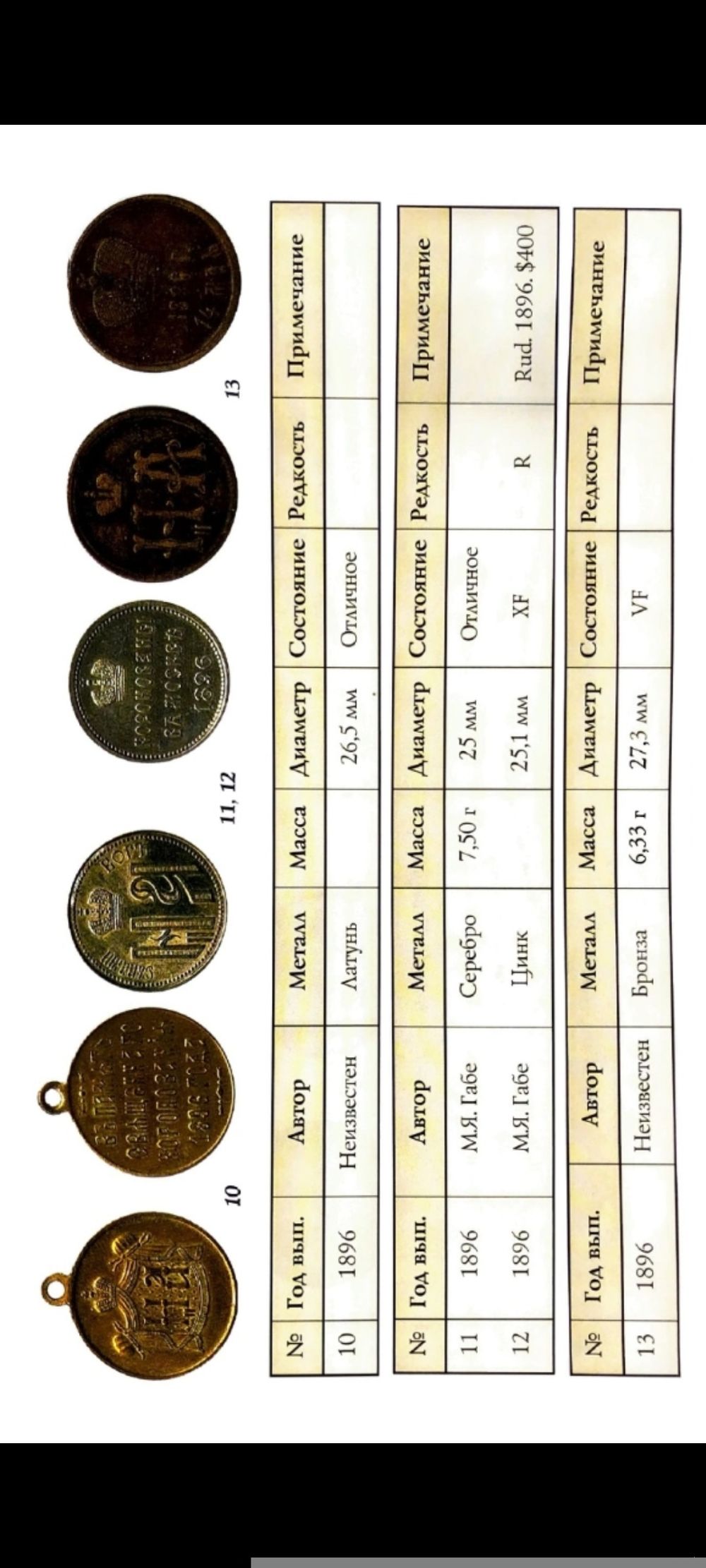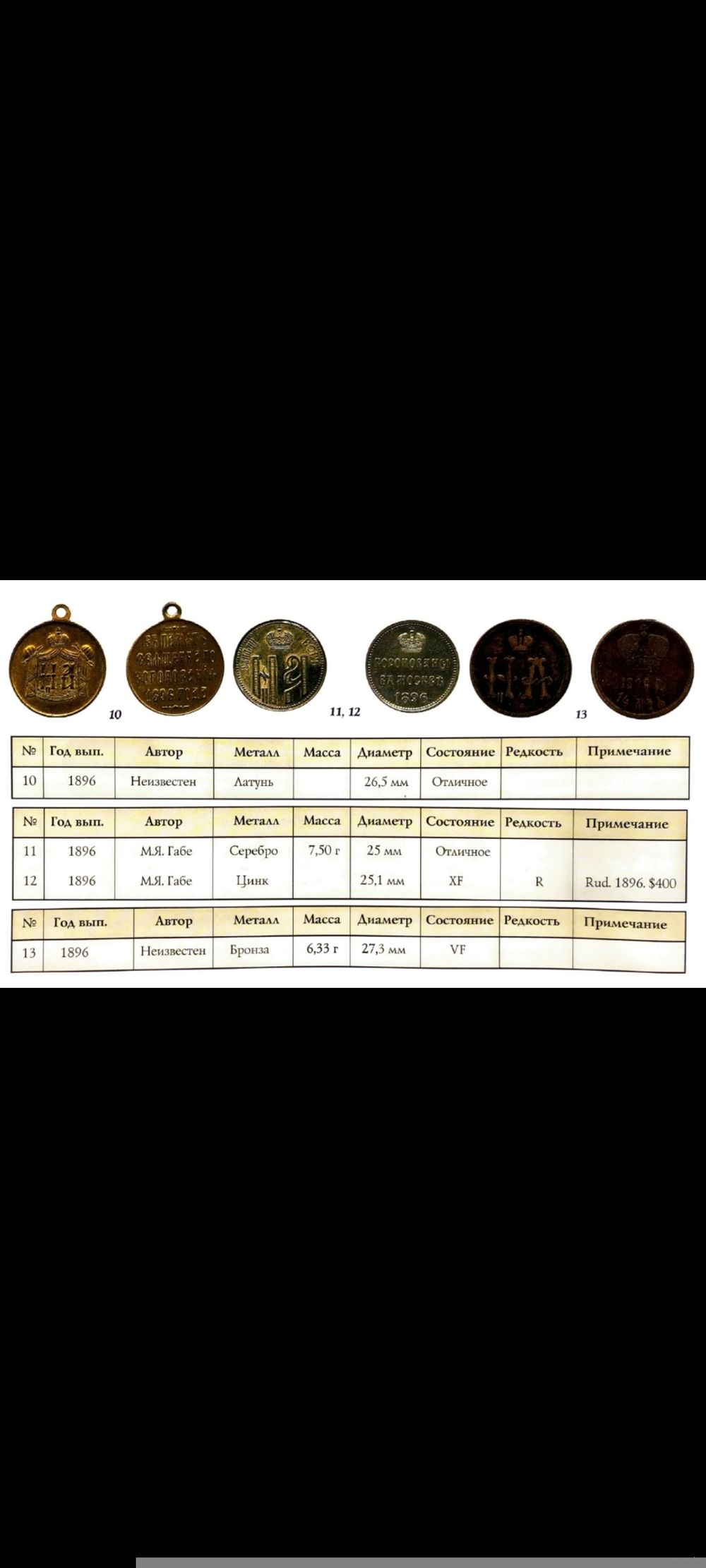 Оборотная сторона: по всему полю жетона надпись в три строки: «КОРОНОВАНЫ ВЪ МОСКВЕ 1896». Выше надписи — корона, а по окружности — бортик и бусы.