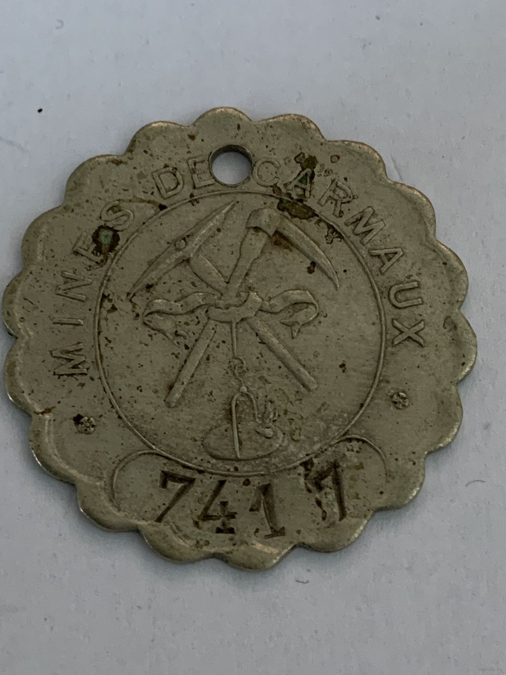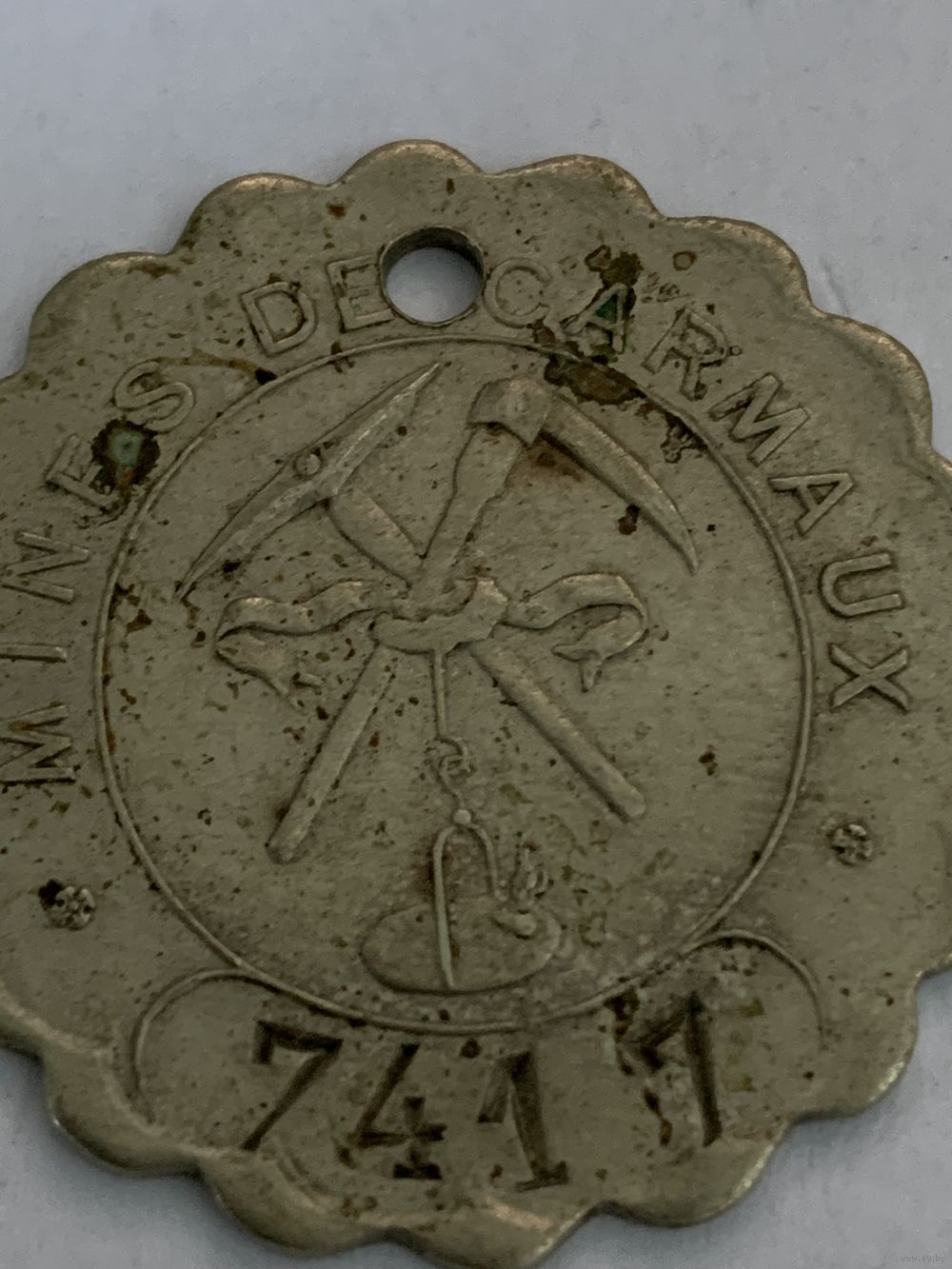 Рабочий жетон горнодобывающей компании Кармо, 1910 год, с эмблемой, присутствующей на титульном листе горнодобывающей шахты в Сент-Барб: след и скрещенные кирка, керосиновая лампа и кожаный пояс,