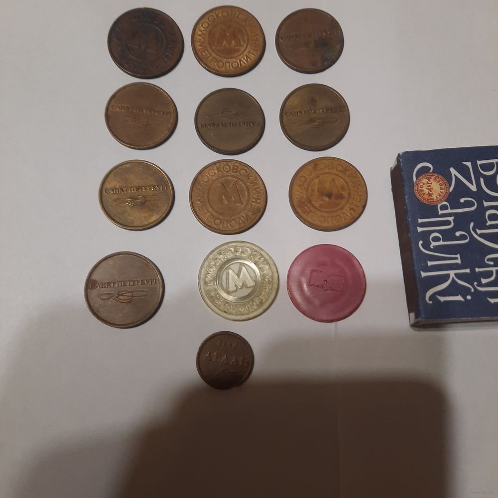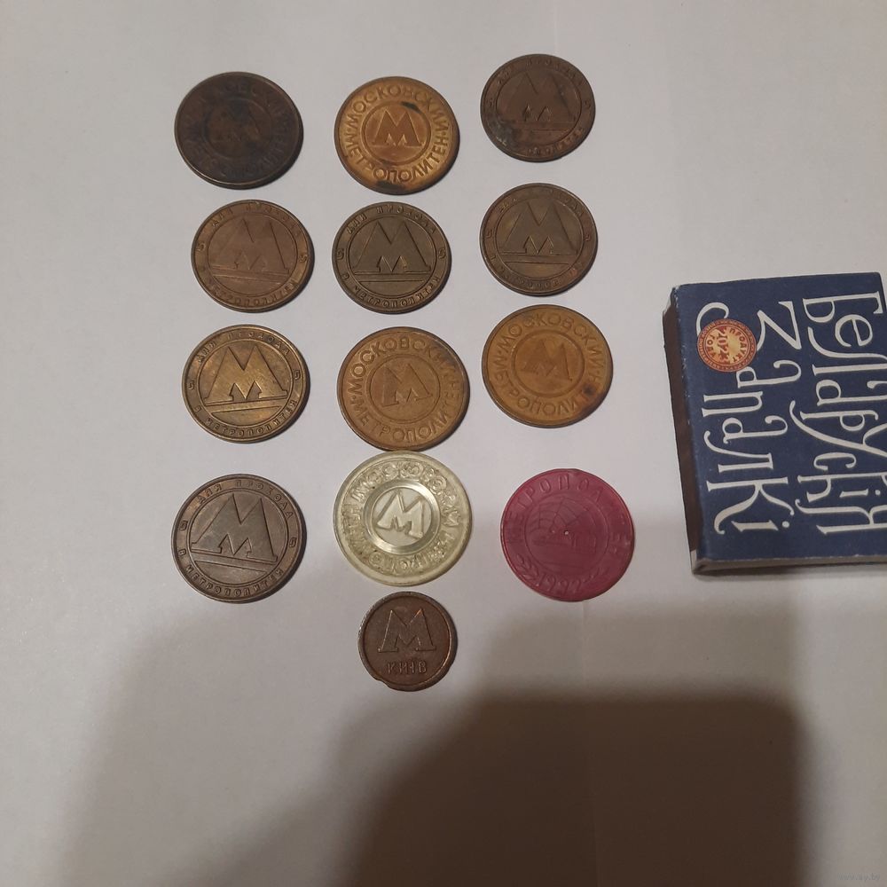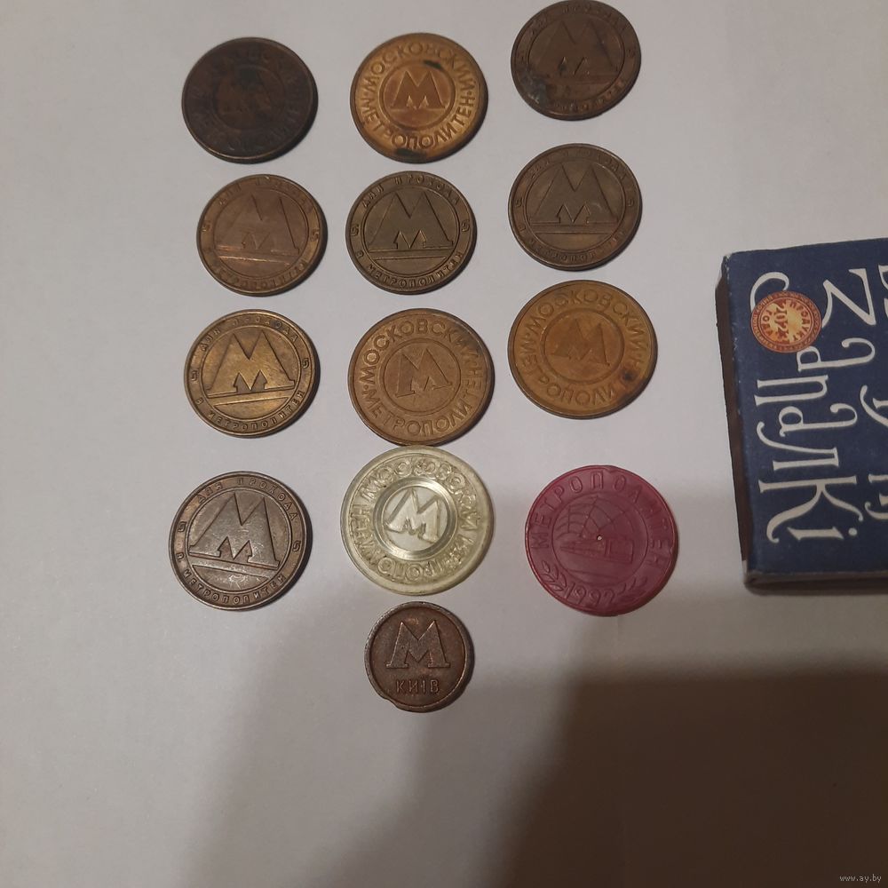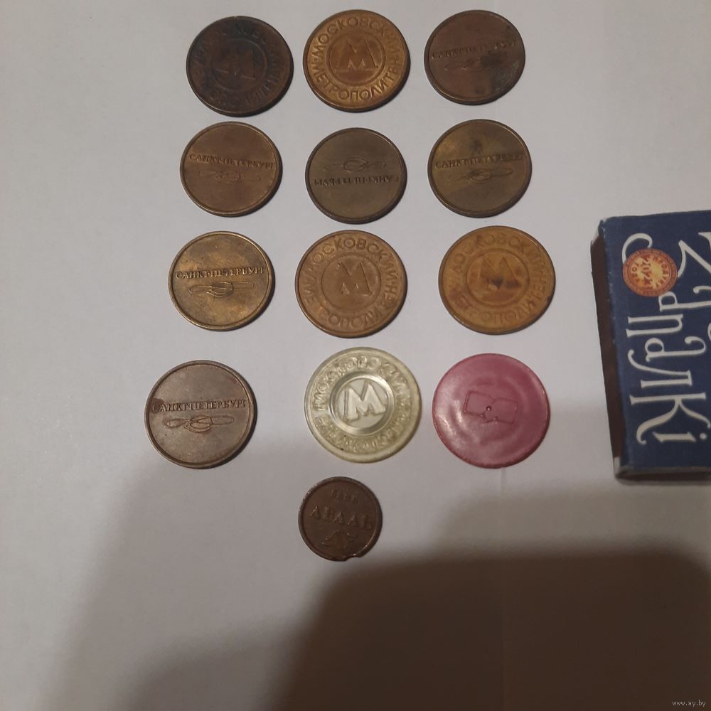 Жетоны метро: Минск, Киев, Санкт-Петербург, Москва.
