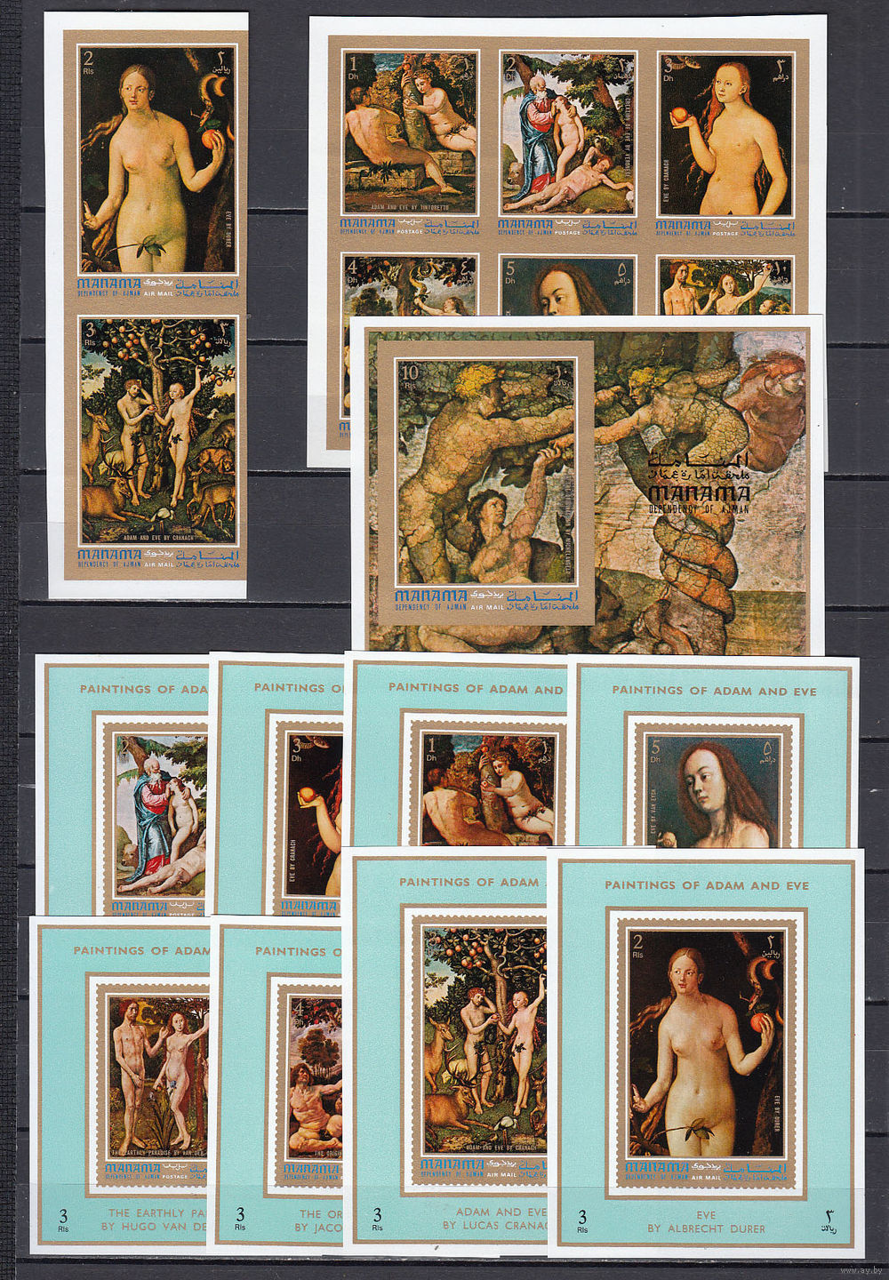 Живопись. Адам и Ева. Манама (ОАЭ). 1971. 8 марок и 9 блоков б/з. Michel N 655-662, бл133 (46,5 е).