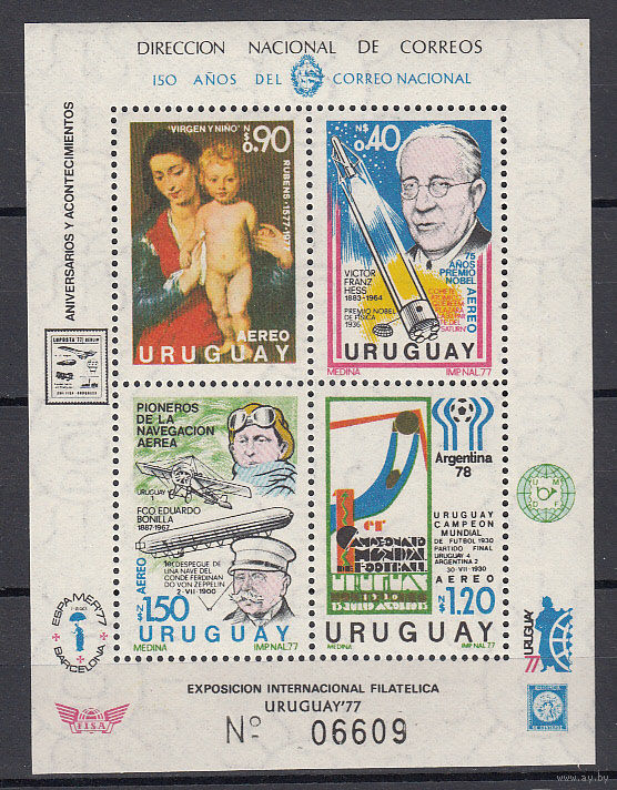 Живопись. Авиация. Космос. Спорт. Уругвай. 1977. 1 блок. Michel N бл24 (35,0 е)