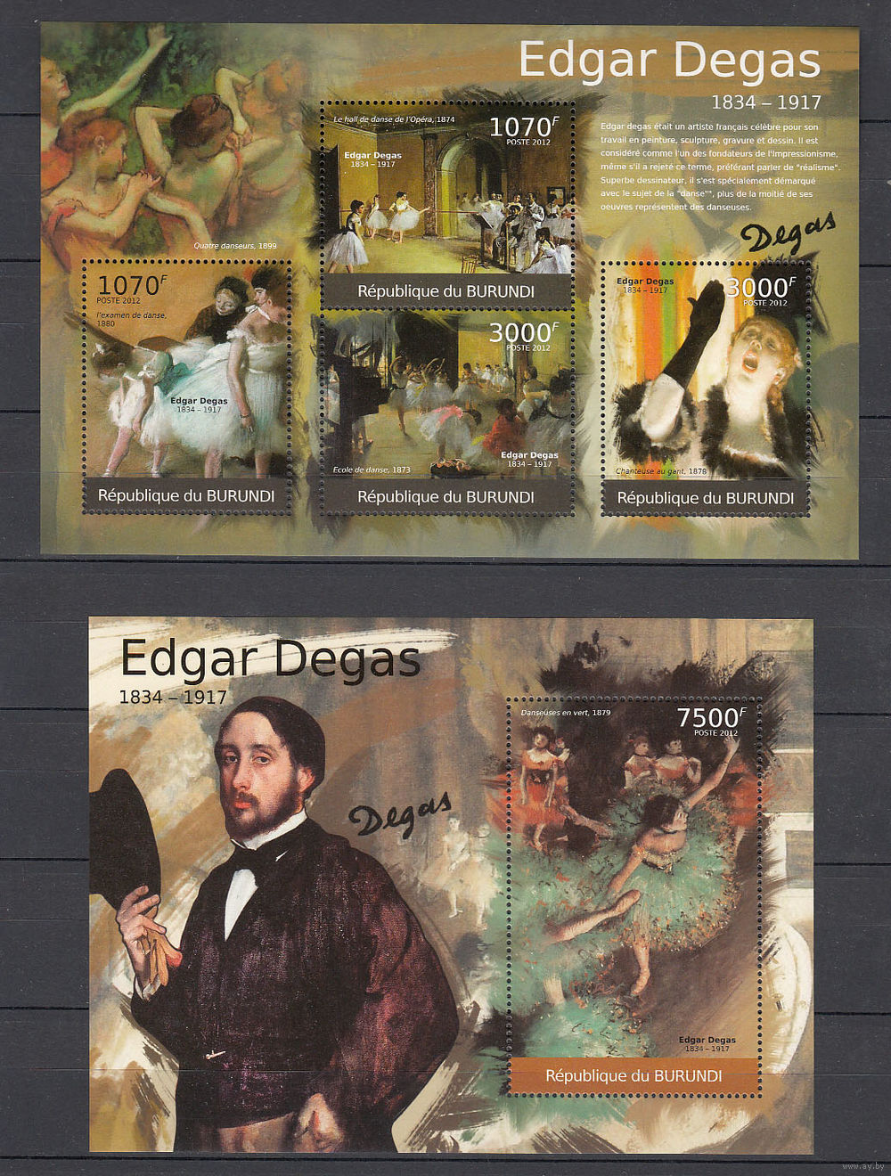 Живопись. Дега. Бурунди . 2012. 1 малый лист и 1 блок. Michel N 2315-2374, бл196-210 (19,0 е)