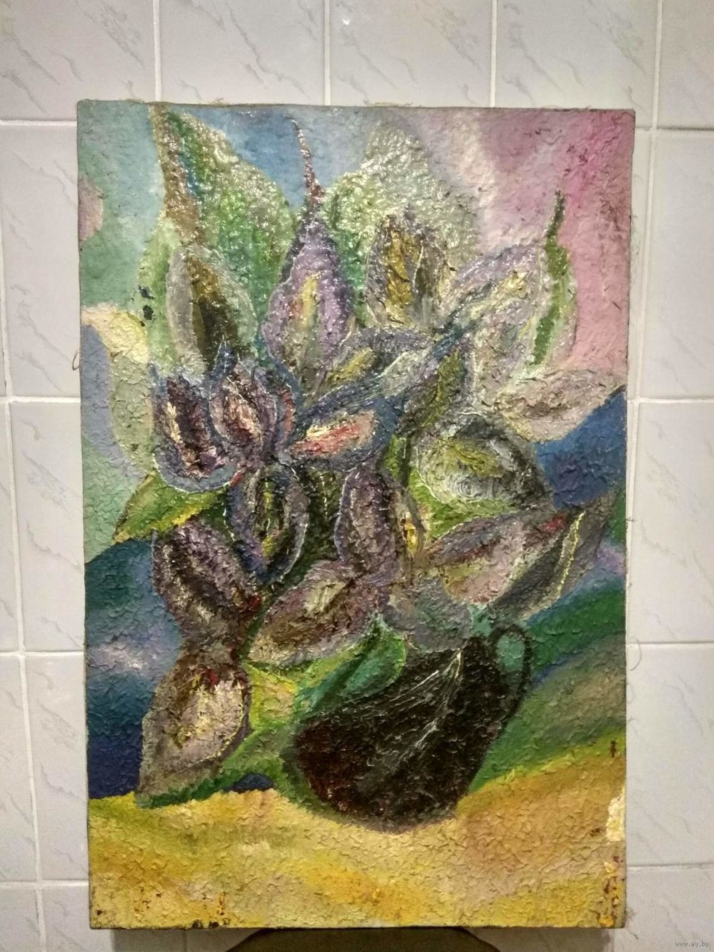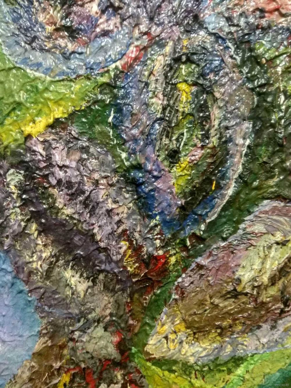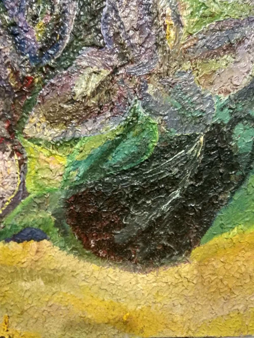 Шикарная рельефная живопись маслом с помощью мастихина. В двух местах есть трещины по краске ввиду толстого слоя на холсте.