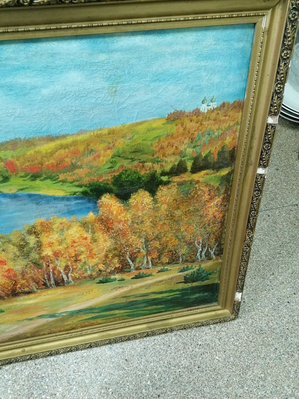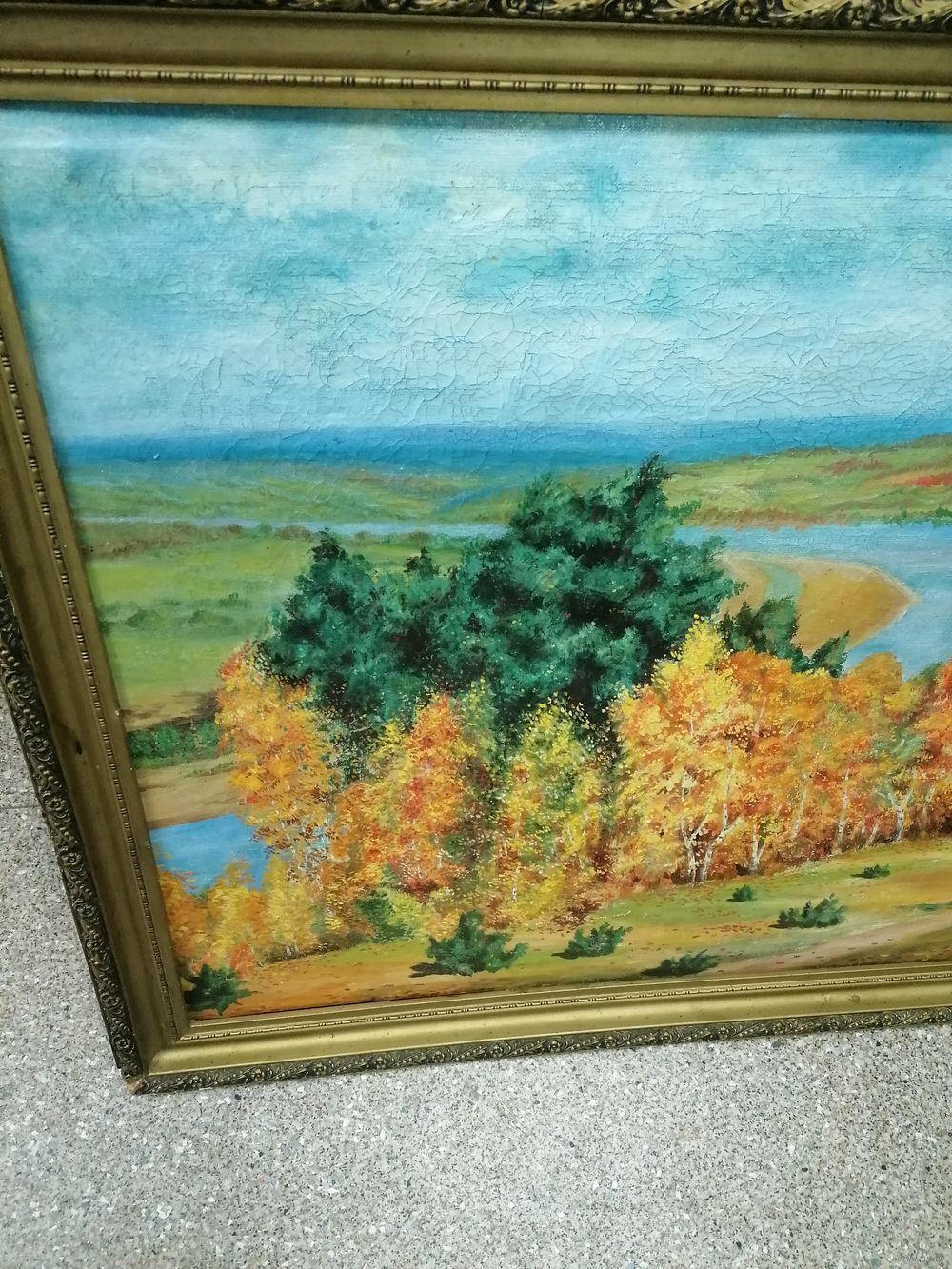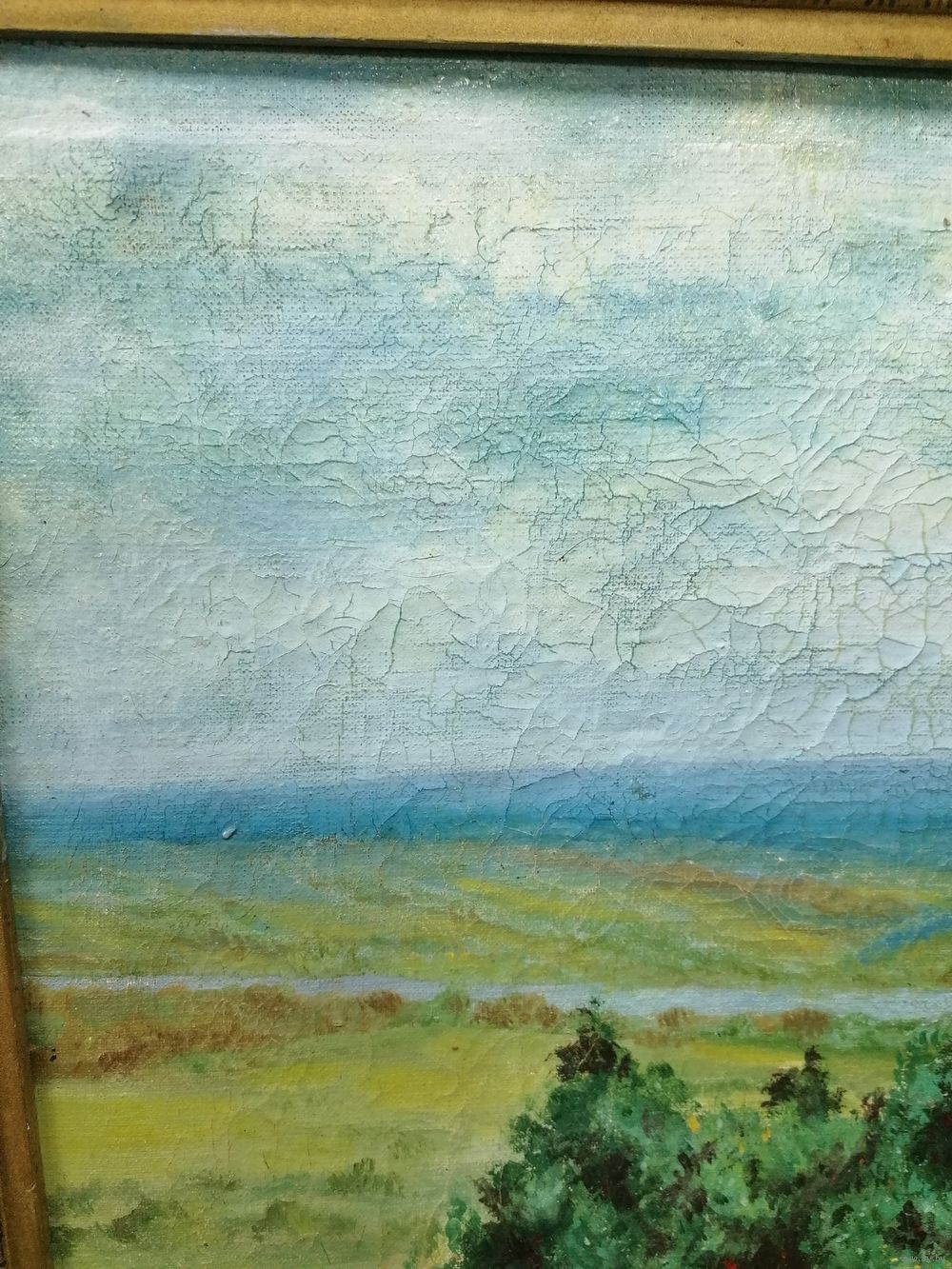 Состояние на фото. Масло, холст. На краске был кракелюр, который чем-то закрепляли. В настоящий момент холст и краски крепкие, несмотря на паутину трещинок по холсту.