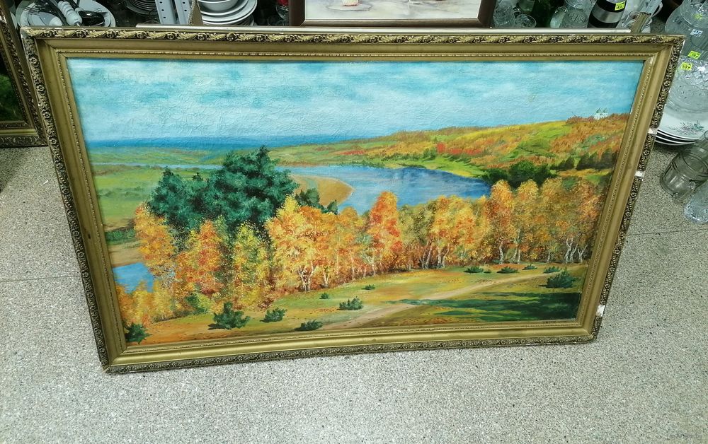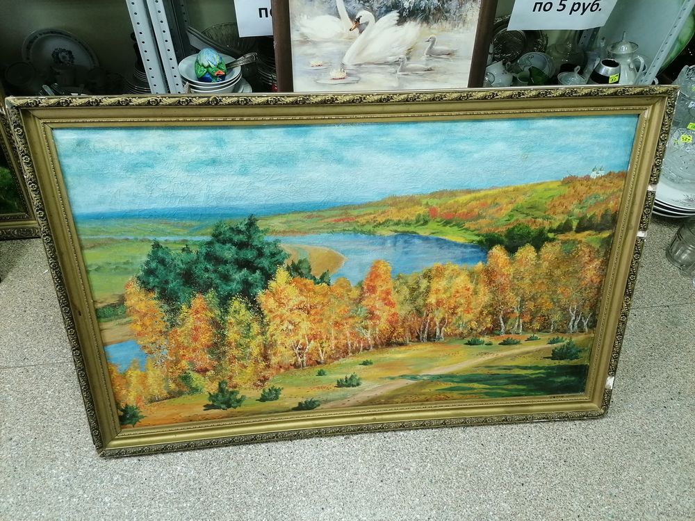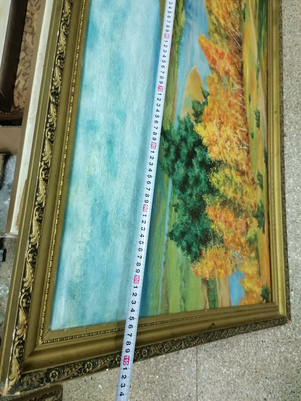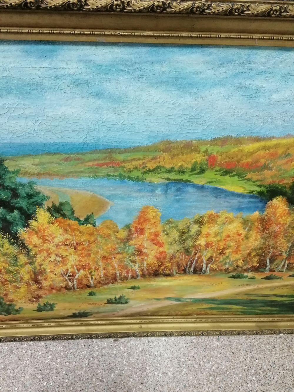 Состояние на фото. Масло, холст. На краске был кракелюр, который чем-то закрепляли. В настоящий момент холст и краски крепкие, несмотря на паутину трещинок по холсту.