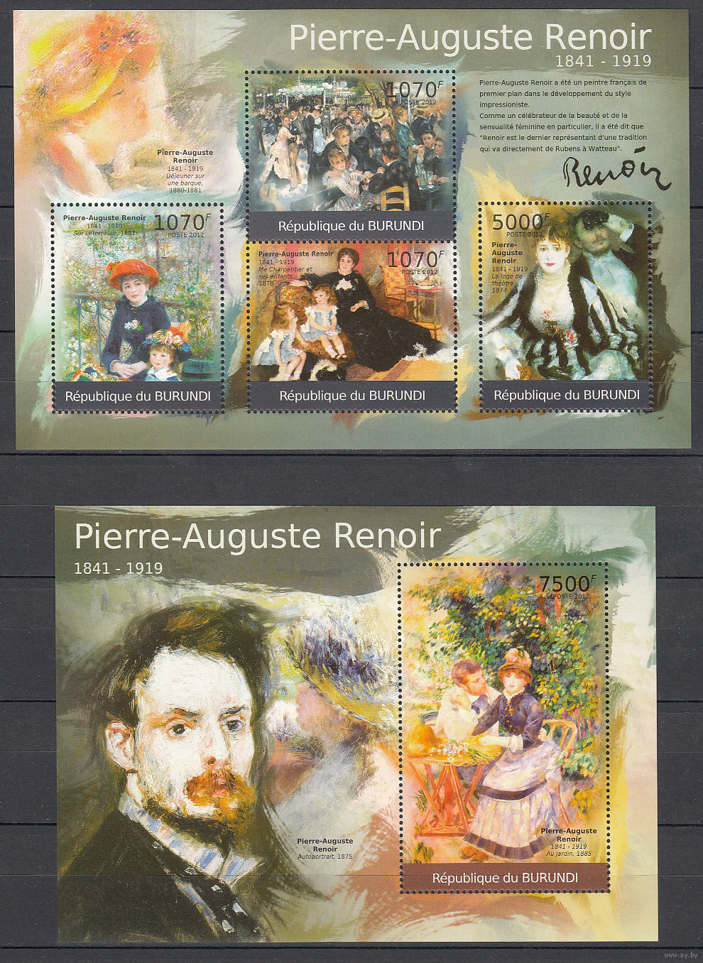 Живопись. Ренуар. Бурунди . 2012. 1 малый лист и 1 блок. Michel N 2315-2374, бл196-210 (19,0 е)