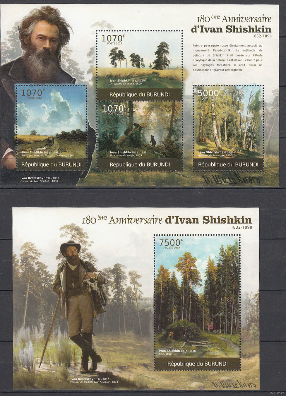 Живопись. Шишкин. Бурунди . 2012. 1 малый лист и 1 блок. Michel N 2315-2374, бл196-210 (19,0 е)