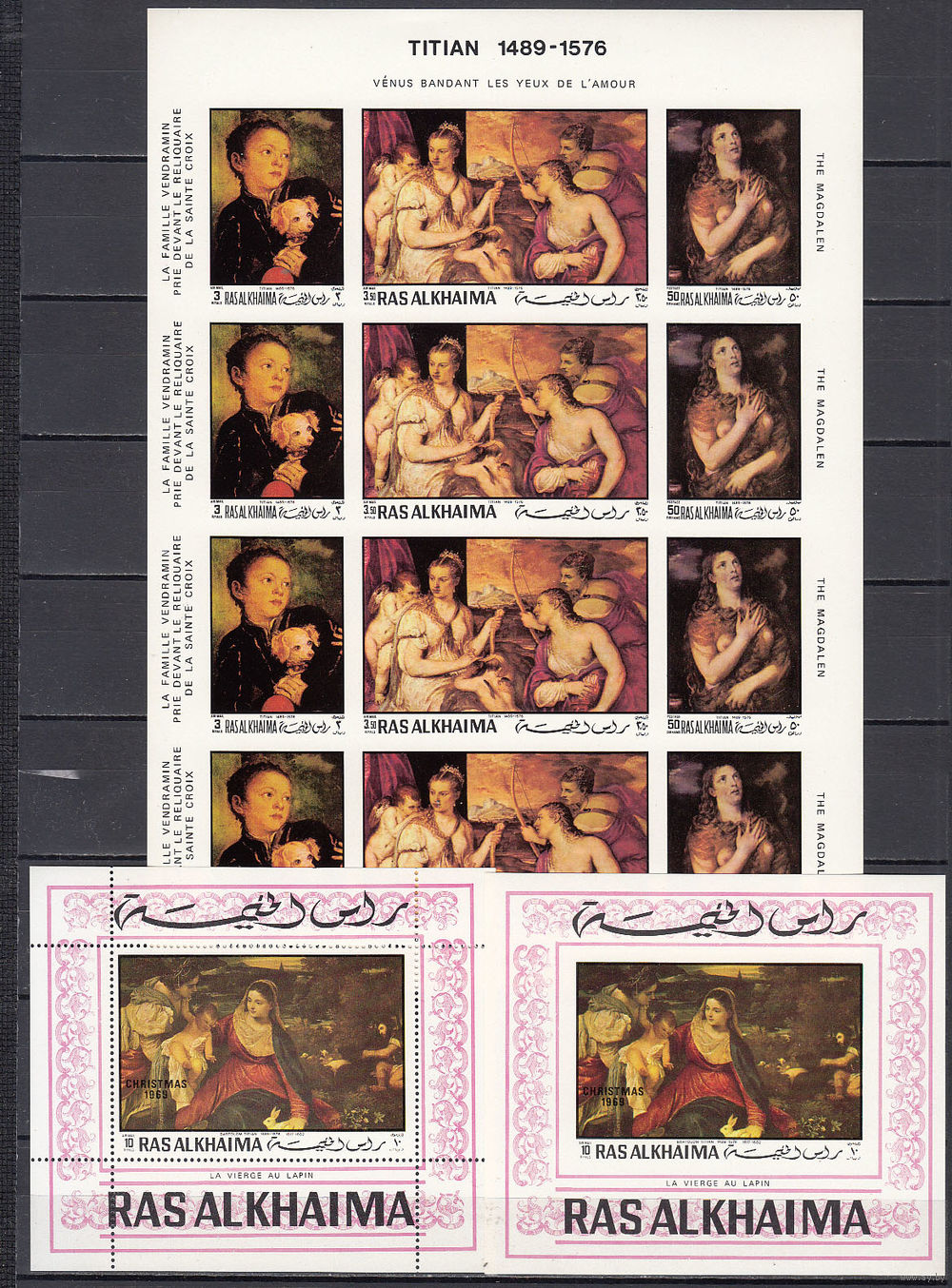 Живопись. Тициан. Рас Эль Хаима (ОАЭ). 1970. 1 малый лист и 2 блока. Michel N 368-370, бл82 (58,5 е)