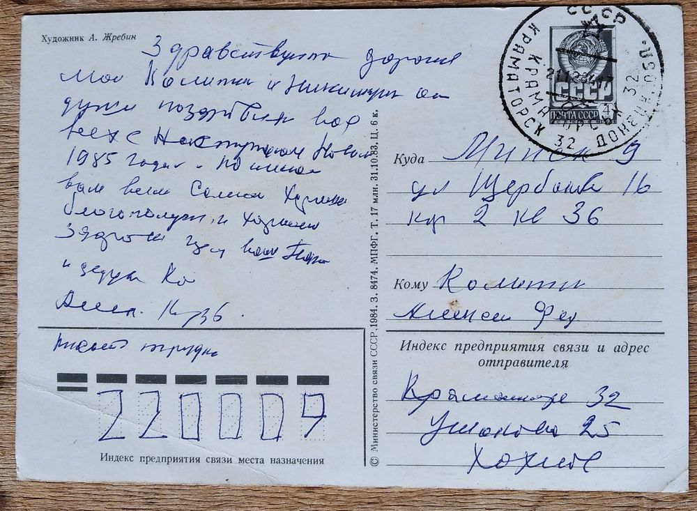 Жребин А. С Новым годом. 1984 г. ПК. Прошла почту.