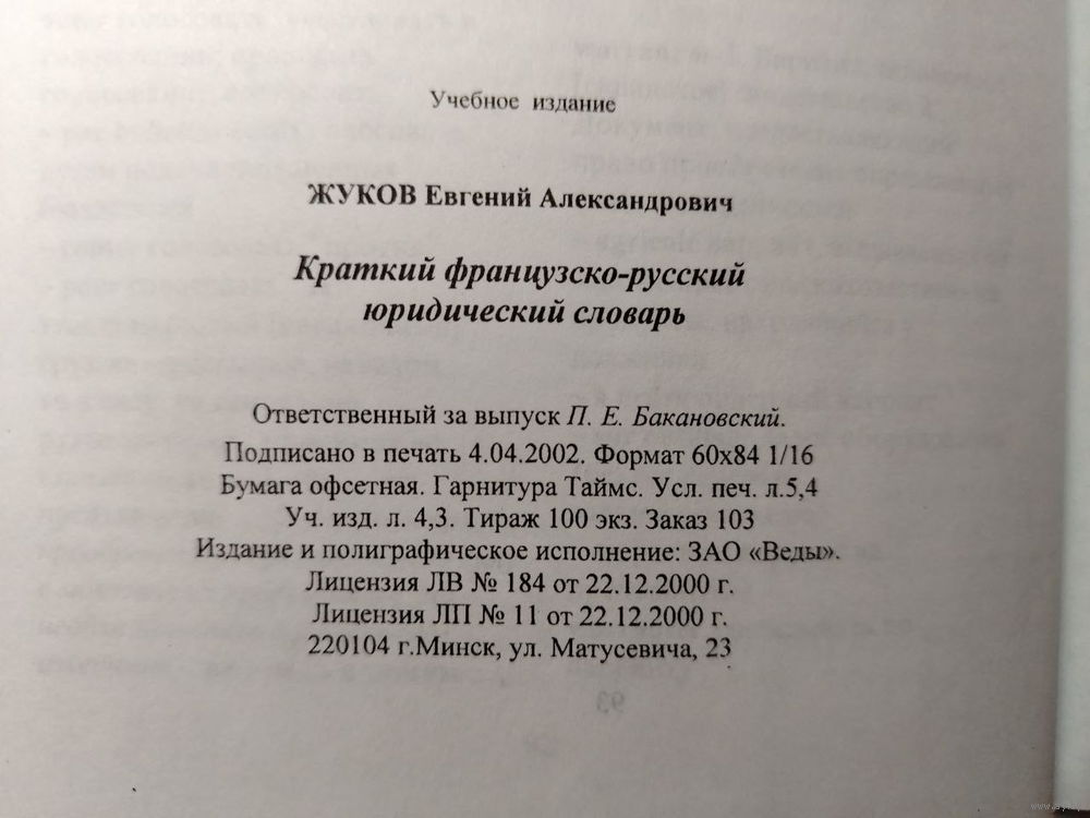 16. Жуков Е.А. Краткий французско-русский юридический словарь. 2002 год. 93 страницы.