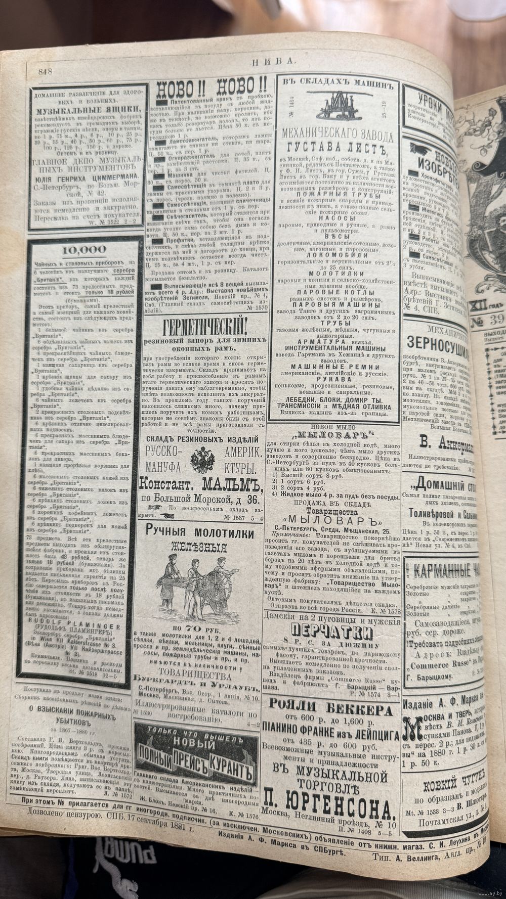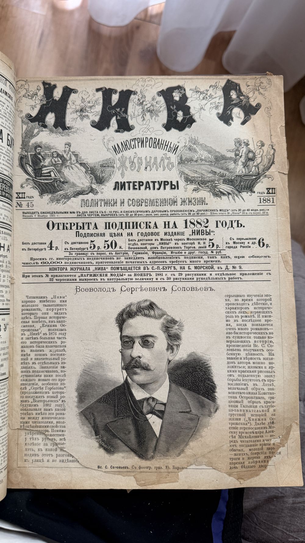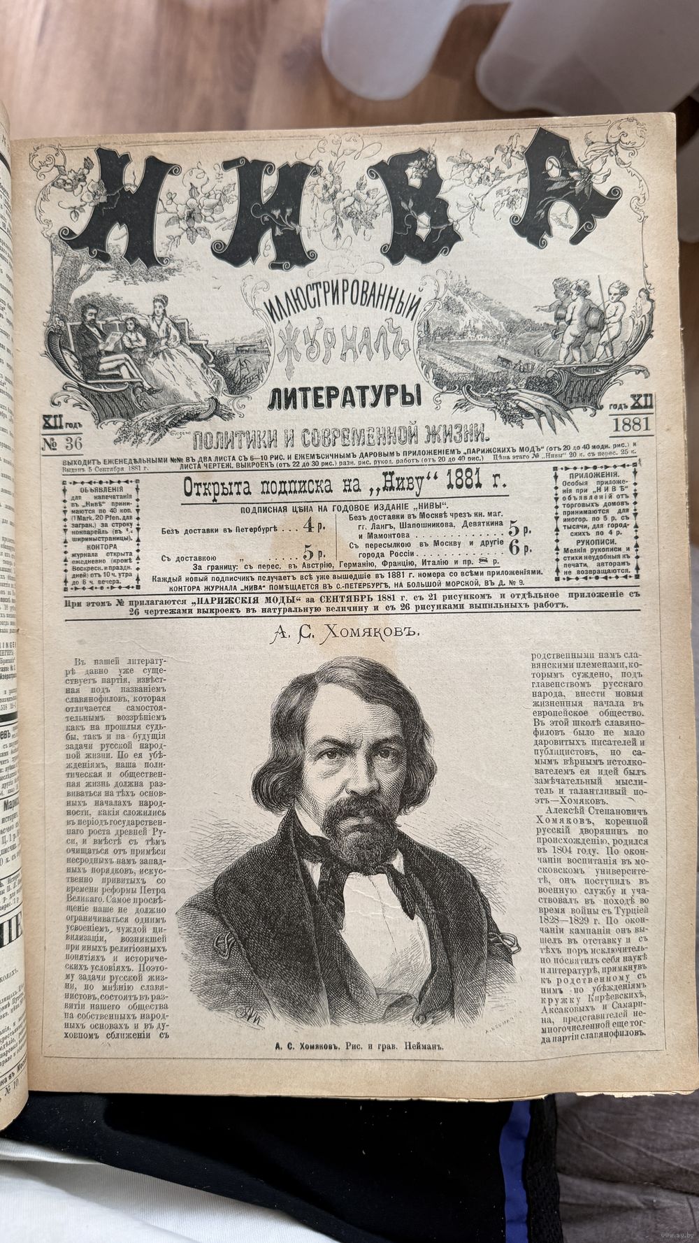 Продается антикварный фолиант — полная подшивка популярного иллюстрированного журнала «Нива» за 1881 год. Это массивное издание в твердом переплете, которое является подлинным свидетельством эпохи и уникальным объектом для частной коллекции.