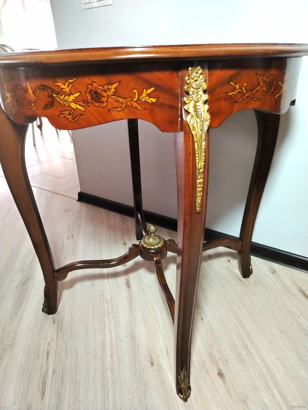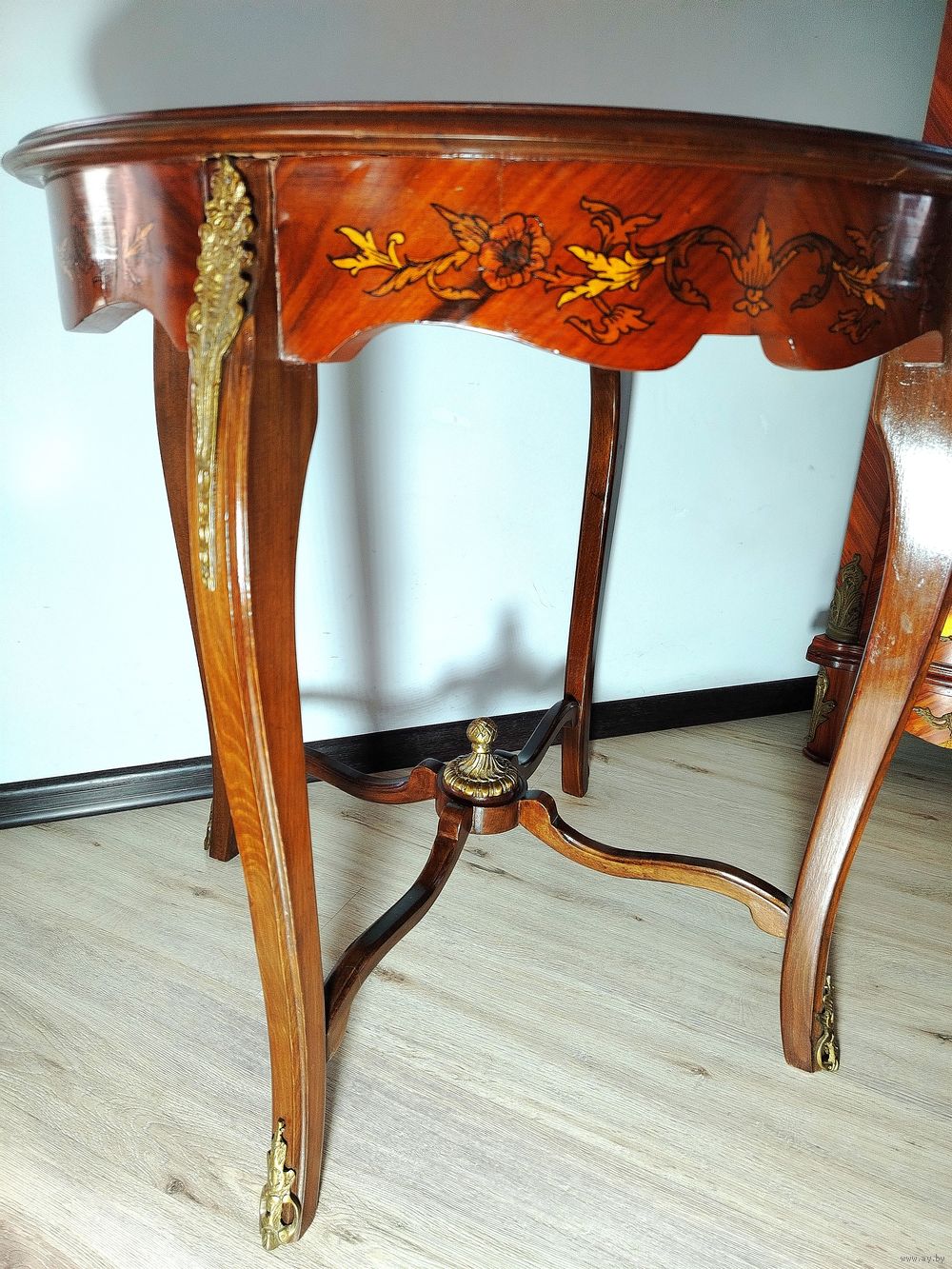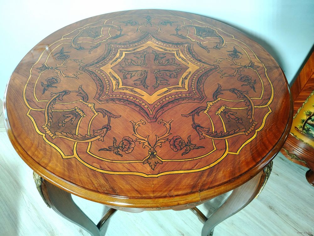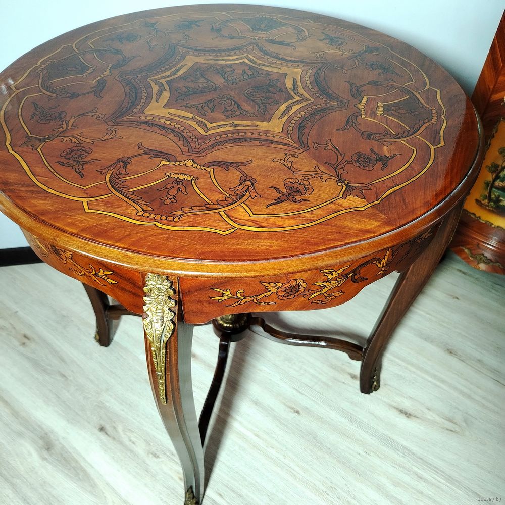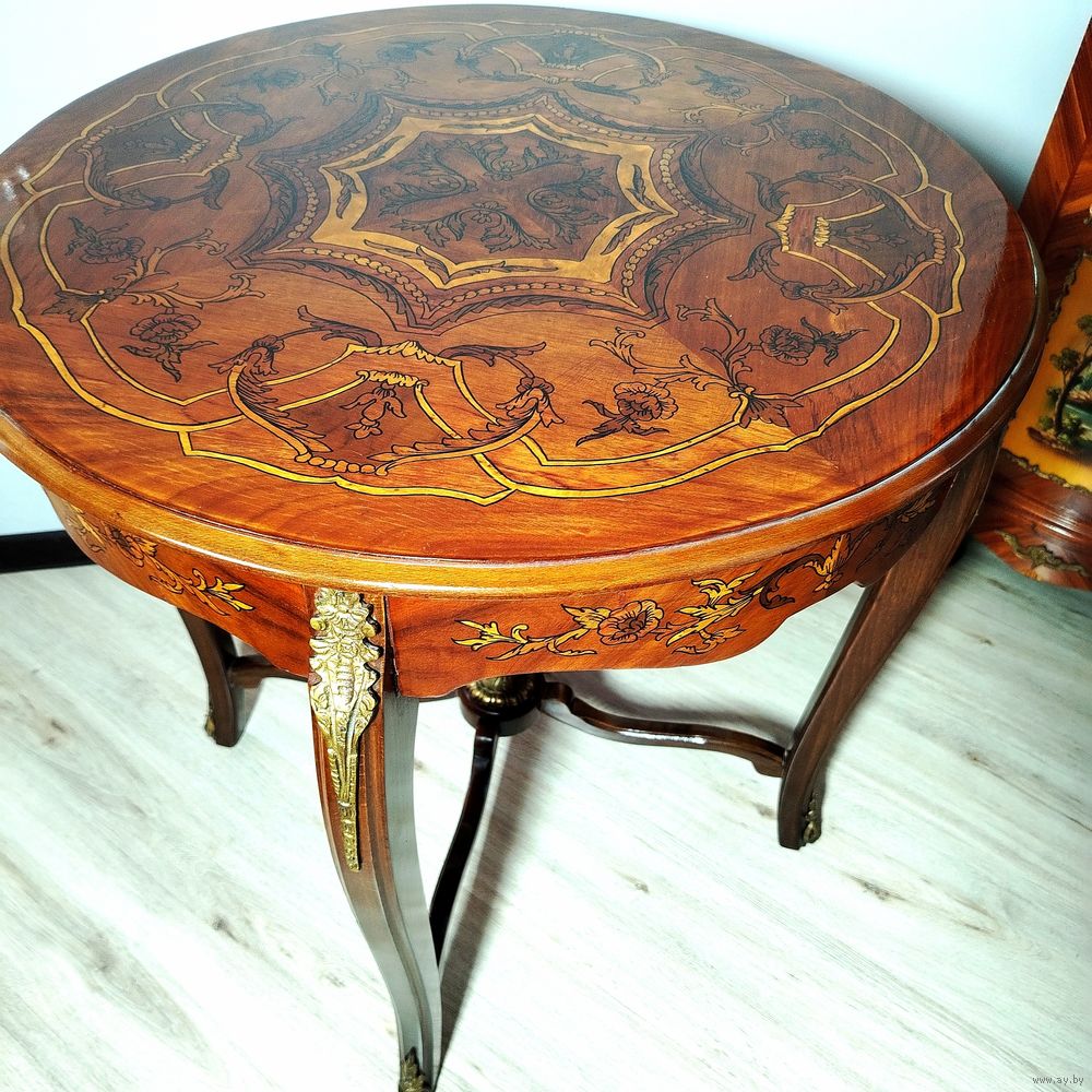 Прекрасный предмет мебели прошлых лет. Европа. Массив дерева, бронзовые элементы, техника маркетри. Высота 74см.диаметр столешницы 72см.