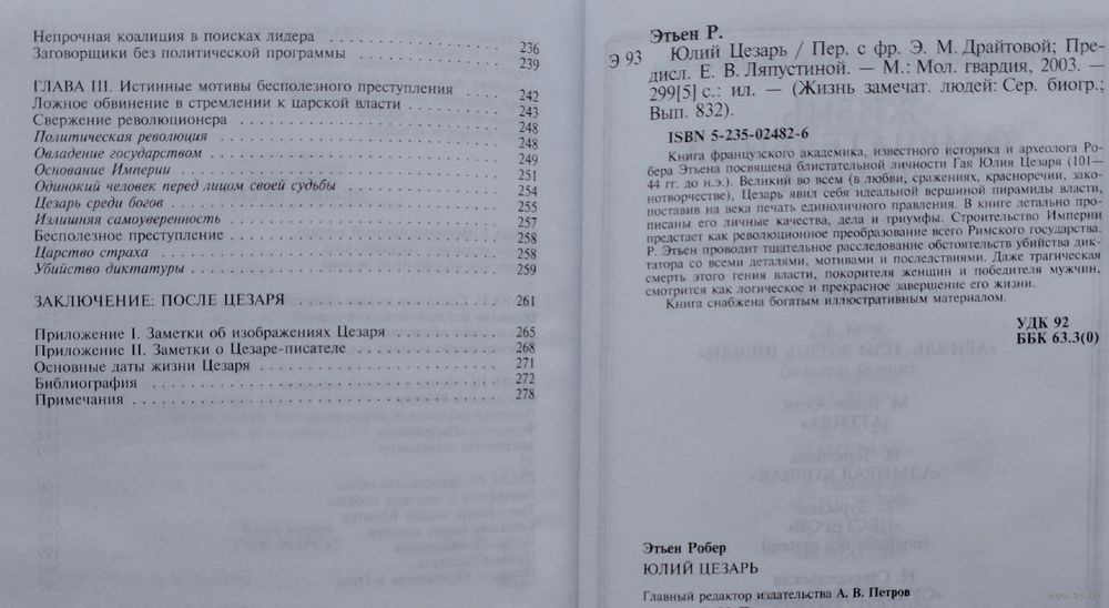 Тираж 5000 экз. 304 стр. Книга французского академика, известного историка и археолога Робера Этьена посвящена блистательной личности Гая Юлия Цезаря (101- 44 гг. до н.э.). Великий во всем (в любви, сражениях, красноречии, законотворчестве), Цезарь явил себя идеальной вершиной пирамиды власти, поставив на века печать единоличного правления. В книге детально прописаны его личные качества, дела и триумфы. Строительство Империи предстает как революционное преобразование всего Римского государства. Р. Этьен проводит тщательное расследование обстоятельств убийства диктатора со всеми деталями, мотивами и последствиями. Даже трагическая смерть этого гения власти, покорителя женщин и победителя мужчин, смотрится как логическое и прекрасное завершение его жизни.