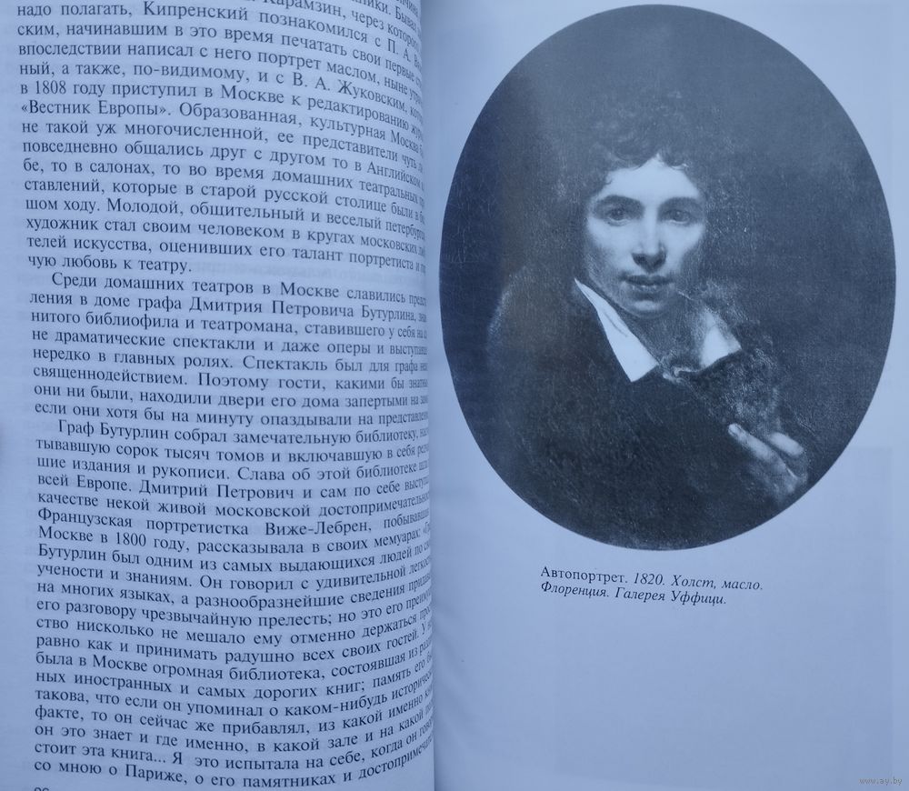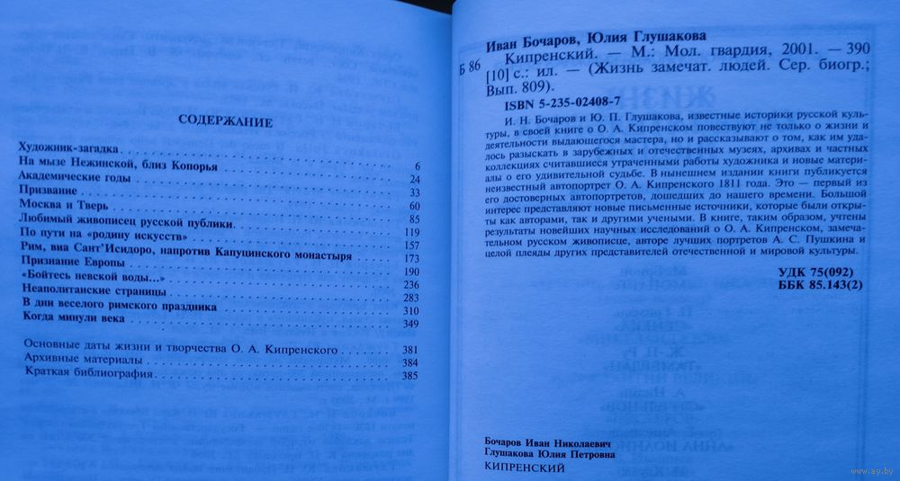 Тираж 5000 экз. 400 стр. И. Н. Бочаров и Ю. П. Глушакова, известные историки русской культуры, в своей книге о О. А. Кипренском повествуют не только о жизни и деятельности выдающегося мастера, но и рассказывают о том, как им удалось разыскать в зарубежных и отечественных музеях, архивах и частных коллекциях считавшиеся утраченными работы художника и новые материалы о его удивительной судьбе. В нынешнем издании книги публикуется неизвестный автопортрет О. А. Кипренского 1811 года. Это — первый из его достоверных автопортретов, дошедших до нашего времени. Большой интерес представляют новые письменные источники, которые были открыты как авторами, так и другими учеными. В книге, таким образом, учтены результаты новейших научных исследований о О. А. Кипренском, замечательном русском живописце, авторе лучших портретов А. С. Пушкина и целой плеяды других представителей отечественной и мировой культуры.