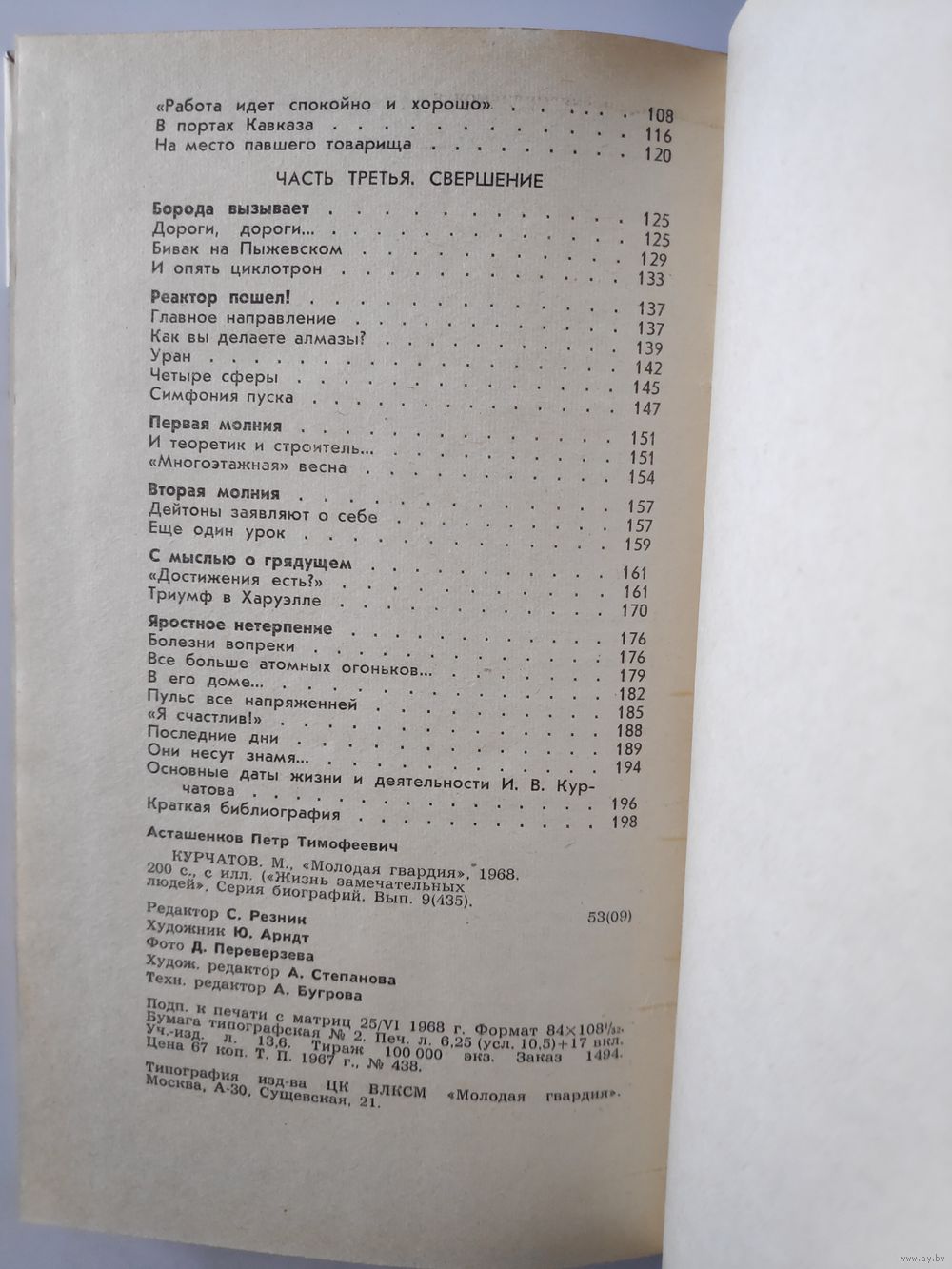 Многие наши ученые обессмертили свое имя тем, что внесли большой вклад в создание основ и дальнейшее развитие советской атомной науки и техники. Среди них достойное место занимает Игорь Васильевич Курчатов (1903-1960), руководивший разработкой в СССР методов производства атомной энергии, созданием ядерного оружия, неизмеримо поднявшего могущество нашей Родины. Жизнь И. В. Курчатова - непрерывный трудовой и научный подвиг. В его жизни отразились все основные этапы борьбы нашей науки за покорение атома. Фотоиллюстрации на отдельных листах.