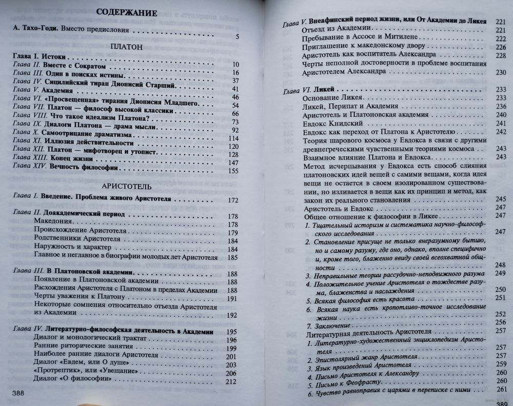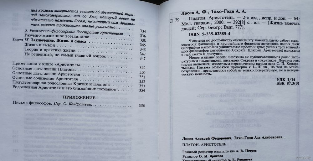 Тираж 5000 экз. 398 стр. Книга А.Ф. Лосева и А.А. Тахо-Годи - плод совместного труда выдающегося философа современности и известного ученого-филолога. Изданием ее в серии `Жизнь замечательных людей` редакция отдает дань памяти Алексею Федоровичу Лосеву, 100-летие со дня рождения которого отмечалось в 1993 году. По мнению авторов книги, судьбы двух великих философов античности Платона и Аристотеля, учителя и ученика, настолько тесно переплетены, что логика требует объединения их жизнеописания в одном издании. Платон 1. Истоки ( стр., илл. 5) 2. Вместе с Сократом ( стр., илл. 11) 3. Один в поисках истины ( стр., илл. 34) 4. Сицилийский тиран Дионисий Старший ( стр., илл. 38) 5. Академия ( стр., илл. 44) 6. Просвещенная тирания Дионисия Младшего ( стр., илл. 52) 7. Платон — философ высокой классики ( стр., илл. 65) 8. Что такое идеализм Платона? ( стр., илл. 73) 9. Диалоги Платона — драма мысли ( стр., илл. 93) 10. Самоотрицание драматизма ( стр., илл. 116) 11. Иллюзия действительности ( стр., илл. 123) 12. Платон — мифотворец и утопист ( стр., илл. 132) 13. Конец жизни ( стр., илл. 151) 14. Вечность философии ( стр., илл. 160) Аристотель 1. Введение. Проблема живого Аристотеля ( стр., илл. 177) 2. Доакадемический период ( стр., илл. 183) 3. В Платоновской Академии ( стр., илл. 194) 4. Литературно-философская деятельность в Академии ( стр., илл. 203) 5. Внеафинский период жизни, или От Академии до Ликея ( стр., илл. 230) 6. Ликей ( стр., илл. 242) 7. Последние годы жизни ( стр., илл. 275) 8. Философия Аристотеля в целом ( стр., илл. 311) 9. Заключение. Жизнь и смысл ( стр., илл. 363) Основные даты жизни Платона ( стр., илл. 367) Основные даты жизни Аристотеля ( стр., илл. 369) Полулегендарная родословная Крития и Платона ( стр., илл. 370) Родословная Аристотеля и его ближайших потомков ( стр., илл. 371) Приложение. Сократ ( стр., илл. 372) 384 стр.