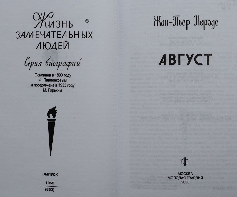 Тираж 5000 экз. 352 стр. Книга французского ученого Ж.-П. Неродо рассказывает об императоре Августе, наследнике и приемнике Гая Юлия Цезаря, основателе Римской империи - — принцепсе Августе (63 г. до н. э. — 14 г. н. э.). Особенностью ее является то, что автор стремится раскрыть не образ политика, a тайну личности этого загадочного человека. Он срывает маску, которую всю жизнь носил первый император, и делает это с чисто французской легкостью, увлекательно и свободно. Неродо досконально изучил все источники, относящиеся к жизни Гая Октавия — Цезаря Октавиана — Августа, и заглянул во внутренний мир этого человека, имевшего последовательно три имени. Полный титул к моменту смерти: Imperator Caesar Divi filius Augustus, Pontifex Maximus, Consul XIII, Imperator XXI, Tribuniciae potestatis XXXVII, Pater Patriae (Император, сын Божественного Цезаря, Август, Великий Понтифик, Консул 13 раз, Император 21 раз, наделен властью народного трибуна 37 раз, Отец Отечества).. В отличие от других биографий, автор сфокусировался не на политических делах, а на личности этого загадочного правителя. Он изучил все доступные источники, чтобы более глубоко понять внутренний мир Августа, который в разные периоды своей жизни носил три разных имени.