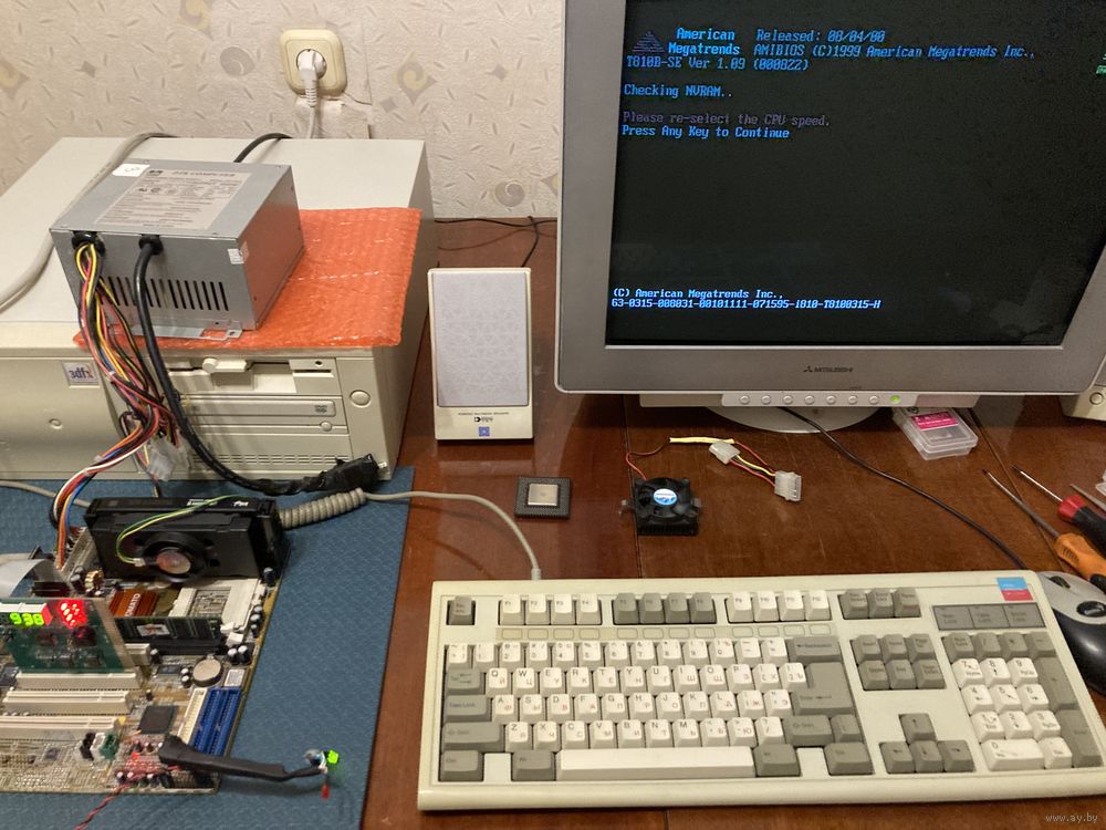 В комплекте идет процессор celeron 366 socket 370, планка памяти на 64 метра,выноска VGA и SOUND, Com.