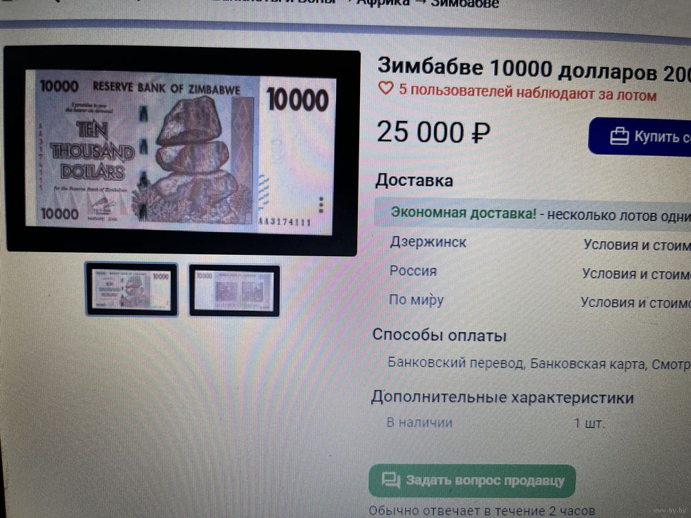 Зимбабве. 10000 долларов RRR (образца 2008 года,с трактором - ошибка на водяном знаке в РБ их нет )