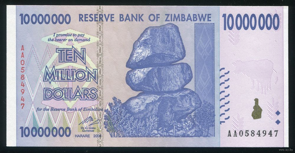 Зимбабве 10000000 долларов 2008 г. P78. Серия AA. UNC