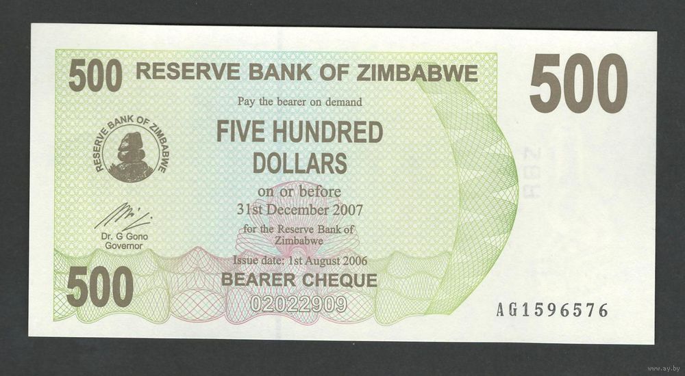 Зимбабве 500 долларов 2007 года. Тип Р-43. Состояние UNC