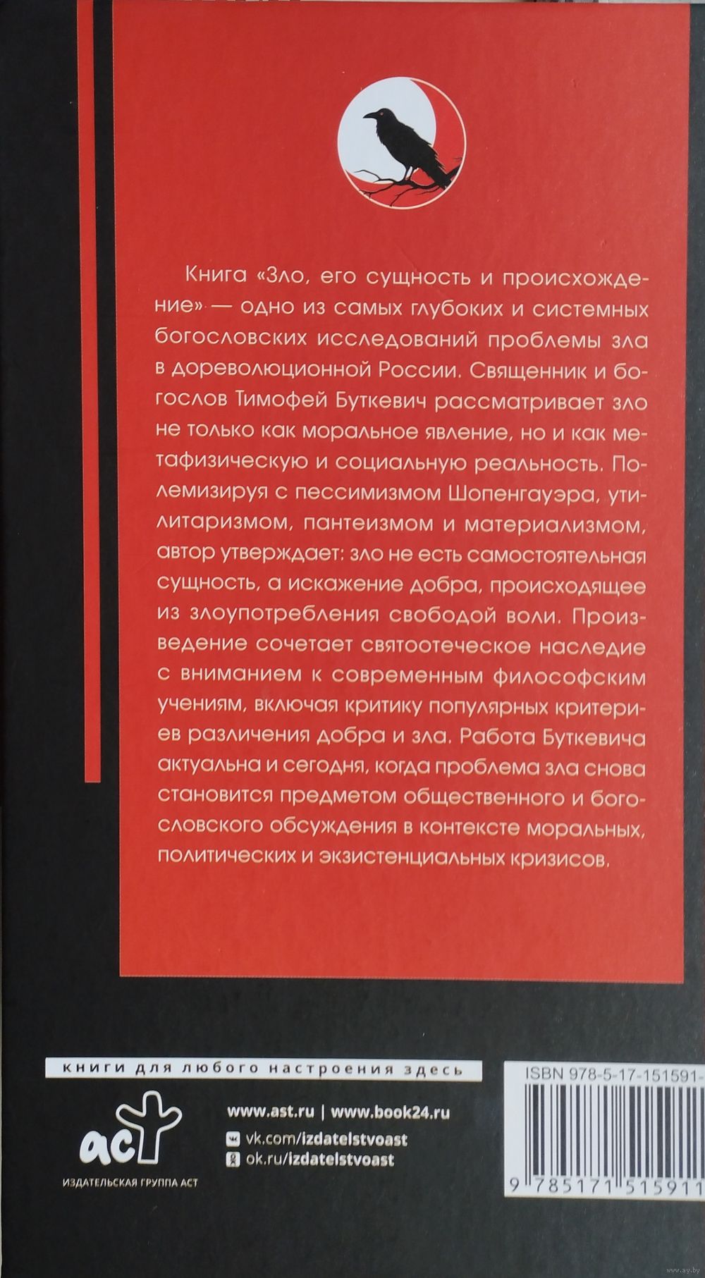 Тираж 2000 экз. 328 стр. Книга «Зло, его сущность и происхождение» – одно из самых глубоких и системных богословских исследований проблемы зла в дореволюционной России. Священник и богослов Тимофей Буткевич (1854-1925) рассматривает зло не только как моральное явление, но и как метафизическую и социальную реальность. Полемизируя с пессимизмом Шопенгауэра, утилитаризмом, пантеизмом и материализмом, автор утверждает: зло не есть самостоятельная сущность, а искажение добра, происходящее из злоупотребления свободой воли. Книга сочетает святоотеческое наследие с вниманием к современным философским учениям, включая критику популярных критериев различения добра и зла. Работа Буткевича актуальна и сегодня, когда проблема зла снова становится предметом общественного и богословского обсуждения в контексте моральных, политических и экзистенциальных кризисов.