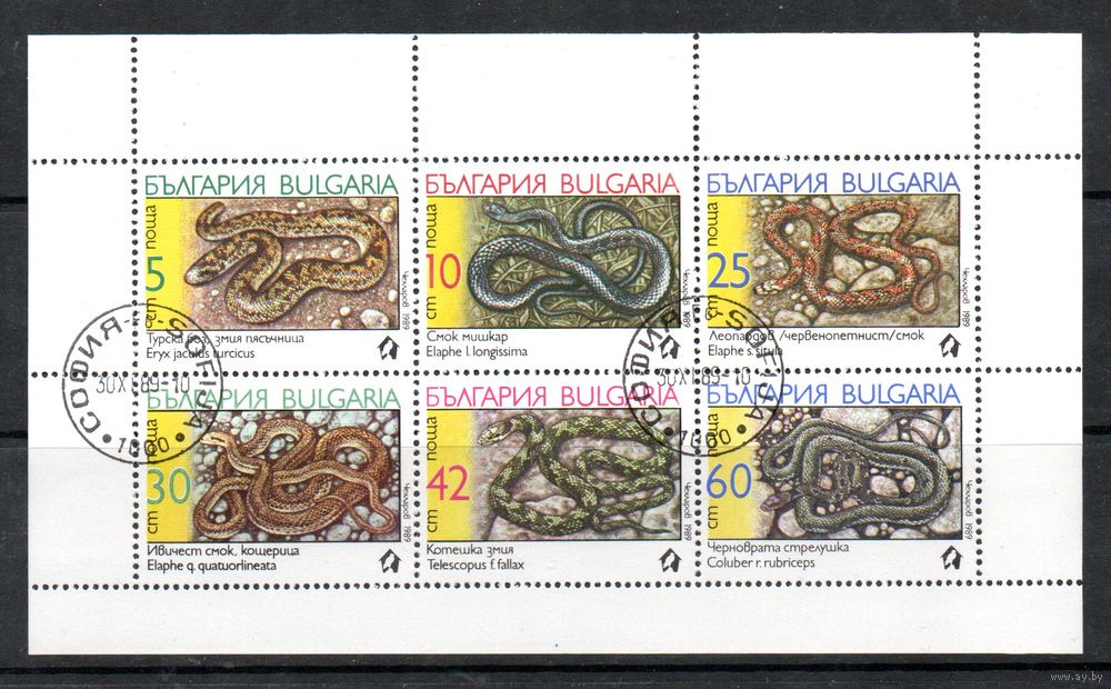 Змеи Болгария 1989 год серия из 6 марок в листе