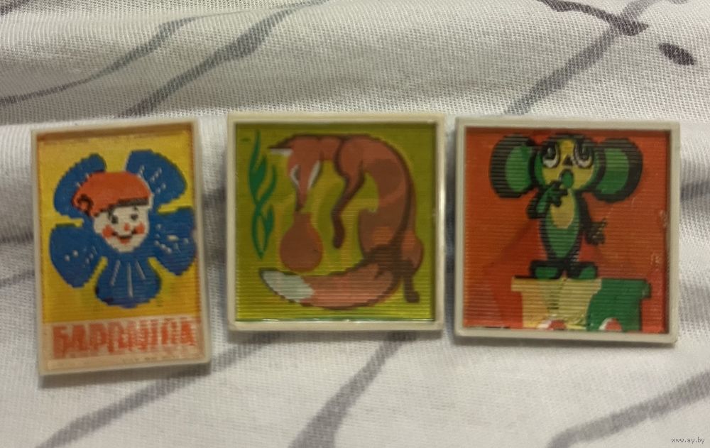 Винтажные советские значки-переливашки (лентикулярные значки) с изображениями героев мультфильмов. Эти значки были популярны в СССР в 1970-х и 1980-х годах.
