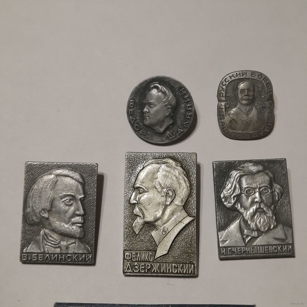 Значки: Шаляпин, Белинский, Дзержинский, Чегнышевский, Поддубный. Одним лотом.