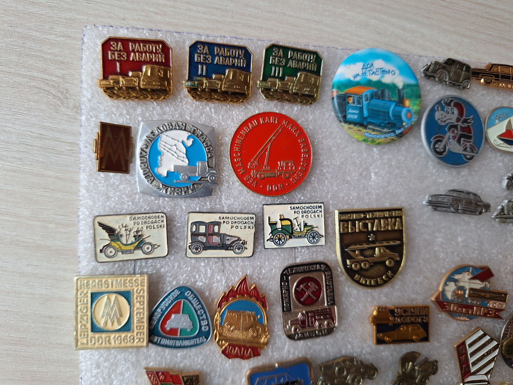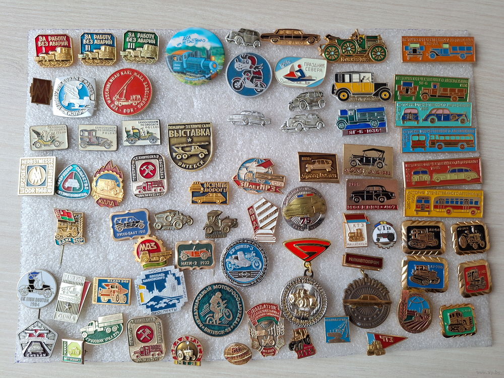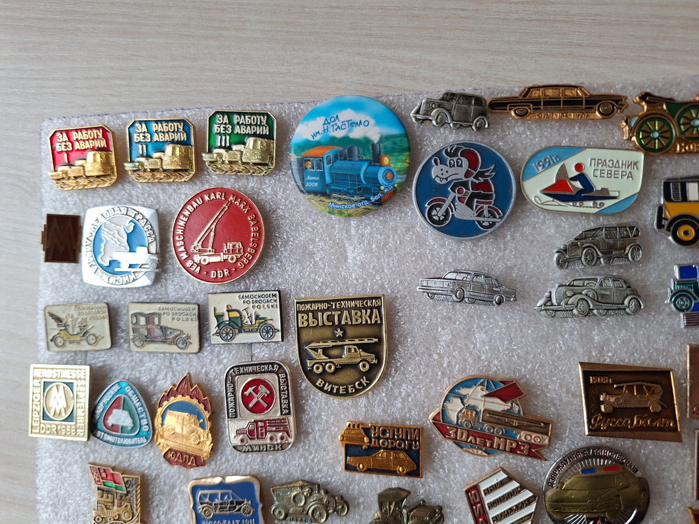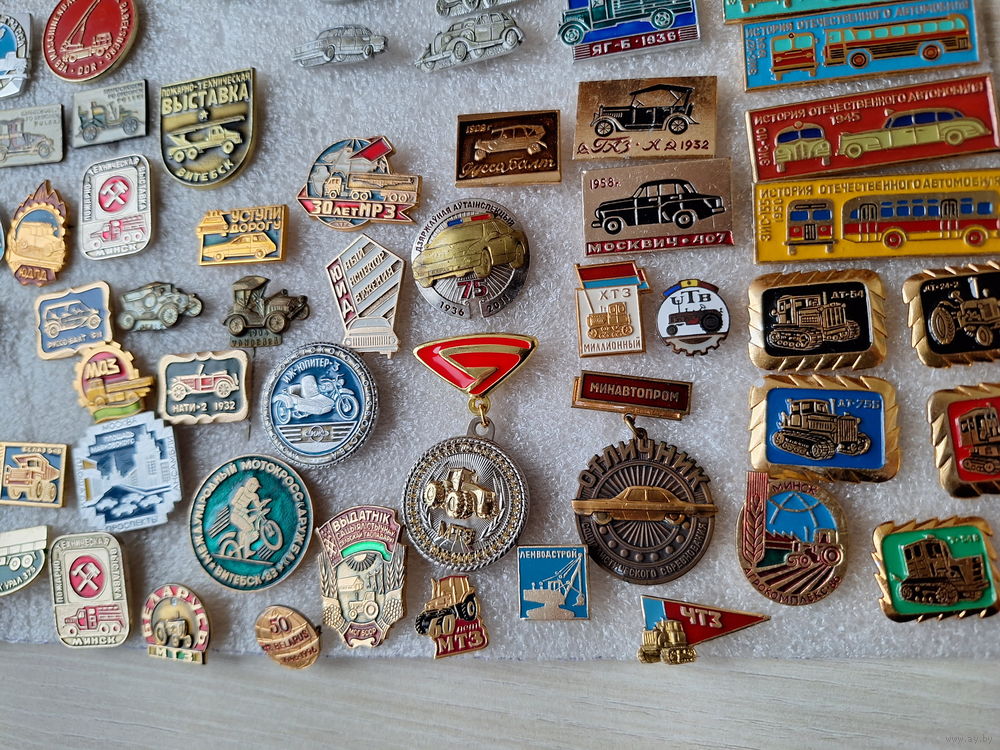 Значки транспорт машины автомобили мотоциклы автобусы тракторы ДОСААФ ЮДПД за работу без аварий история отечественного автомобиля 30 лет МРЗ пожарно-техническая выставка и др.