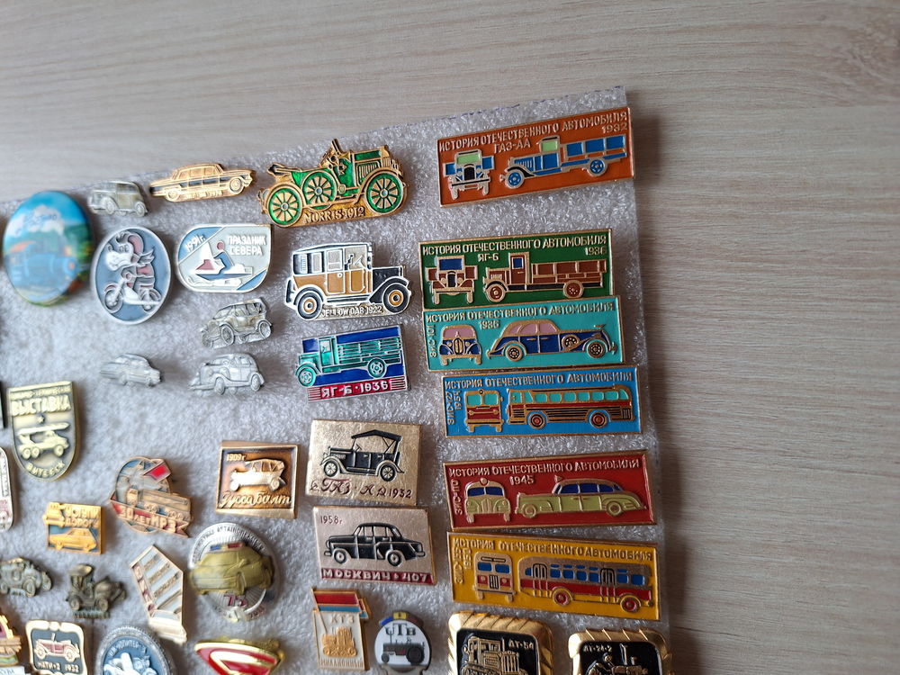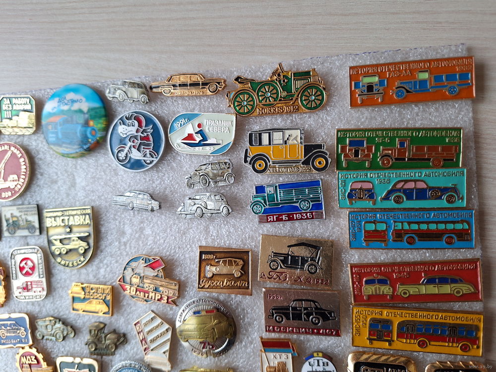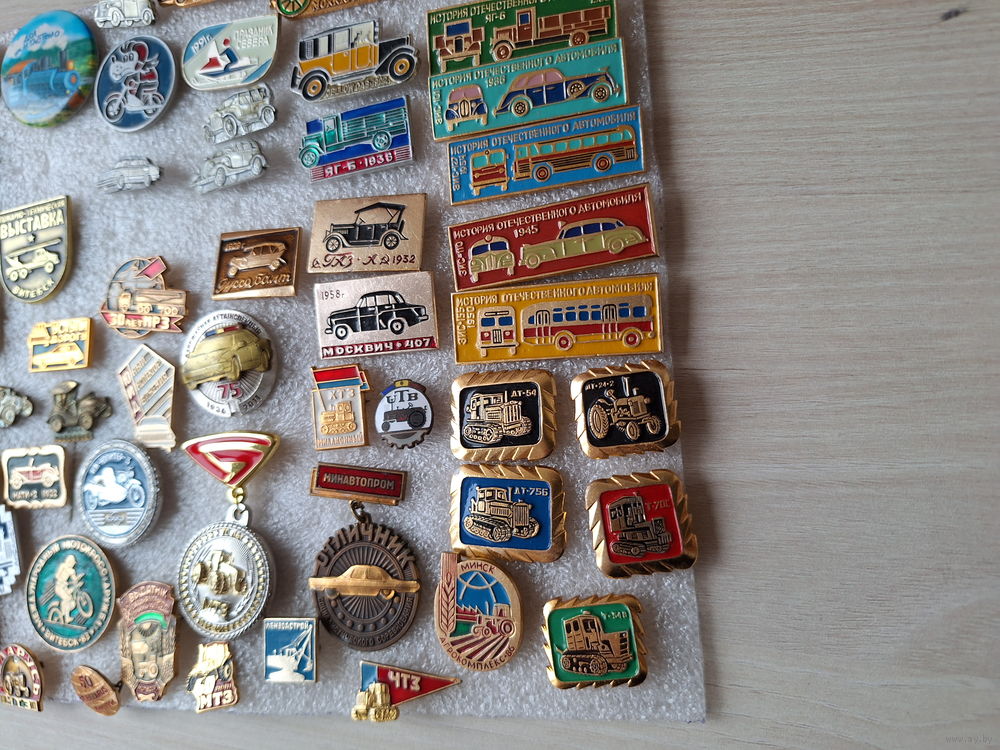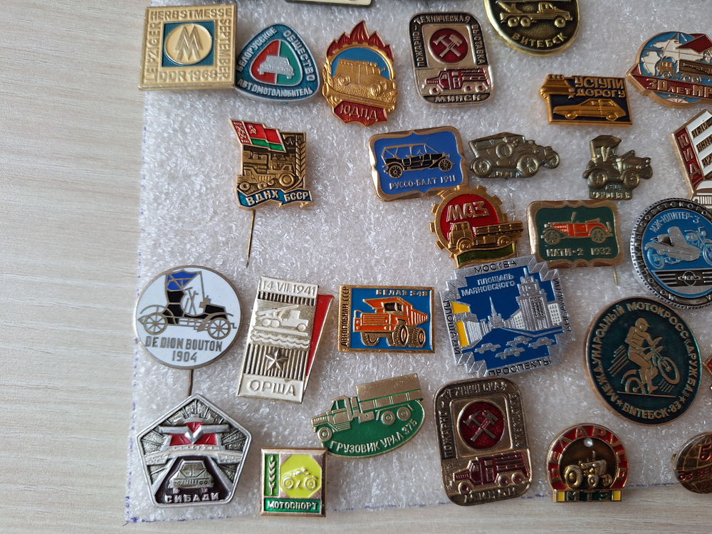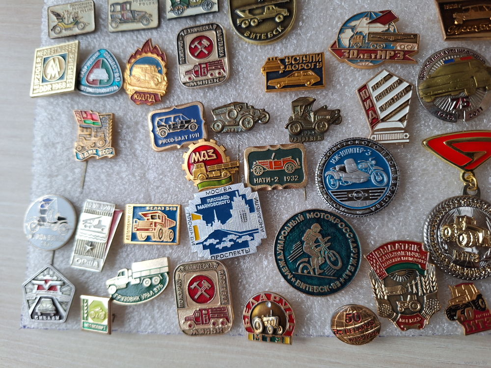 Значки транспорт машины автомобили мотоциклы автобусы тракторы ДОСААФ ЮДПД за работу без аварий история отечественного автомобиля 30 лет МРЗ пожарно-техническая выставка и др.