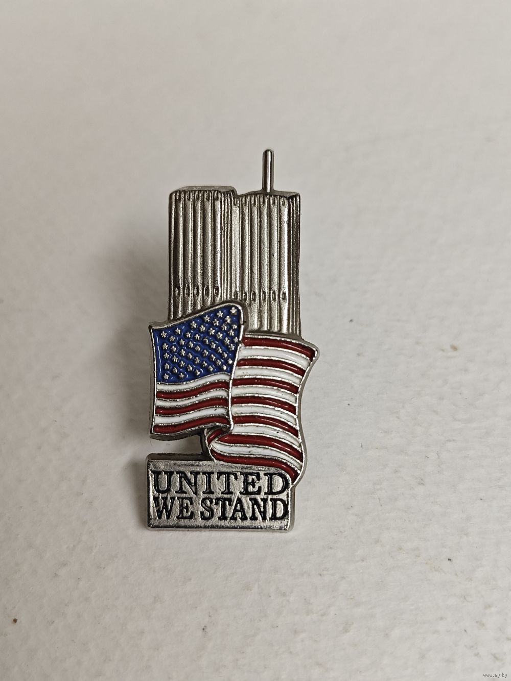Памятный значок с изображением башен-близнецов Всемирного торгового центра и флага США. Значок является мемориалом жертвам терактов 11 сентября.