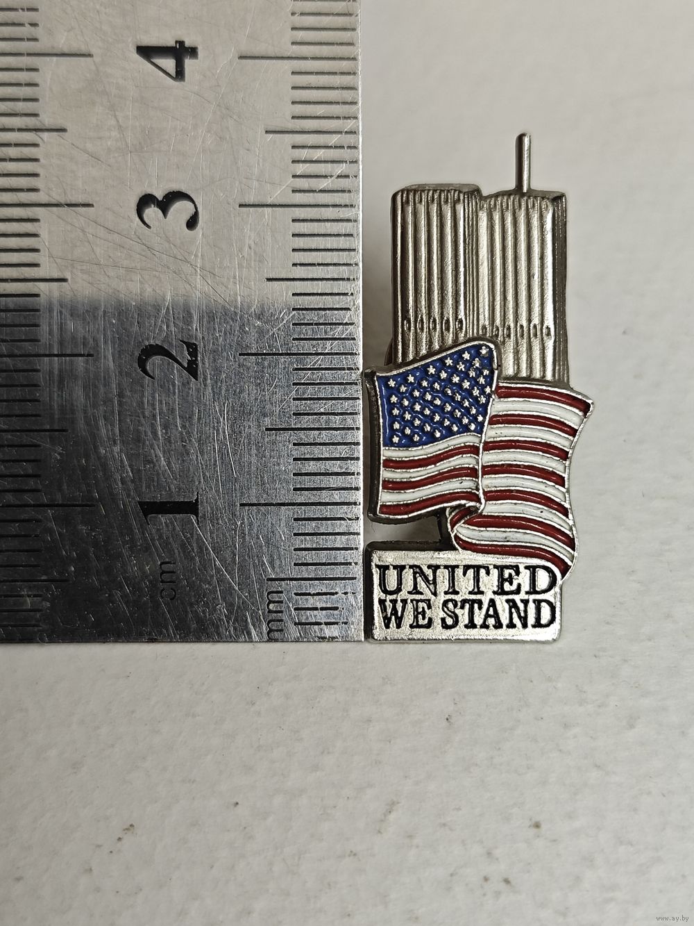 Надпись на значке гласит: "UNITED WE STAND" (Мы едины).