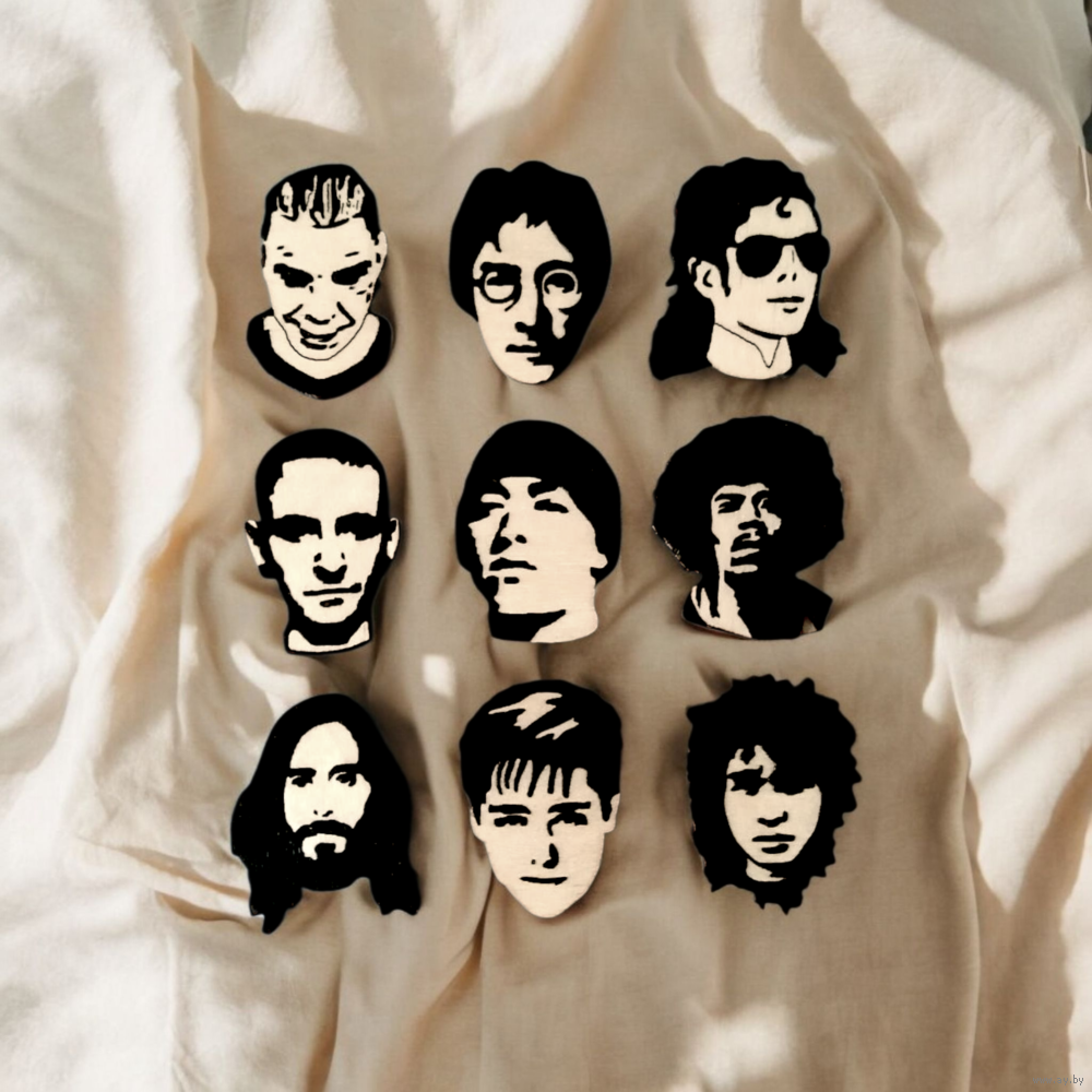 Значки-броши (пины) изображающие легендарных музыкантов и культовых знаменитостей: Майкл Джексон / Michael Jackson; Джон Леннон / John Lennon; Джими Хендрикс / Jimi Hendrix; Тилль Линдеманн / Till Lindemann (Рамштайн / Rammstein); Честер Беннингтон / Chester Bennington (Линкинг Парк / Linking Park); Эминем / Еминем / Eminem (Marshall / Маршалл; Marshall Bruce Mathers / Маршалл Брюс Мэтерс); Джаред Лето / Jared Leto; Виктор Цой (Кино); Юрий Шатунов.