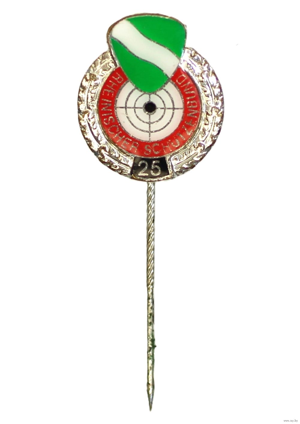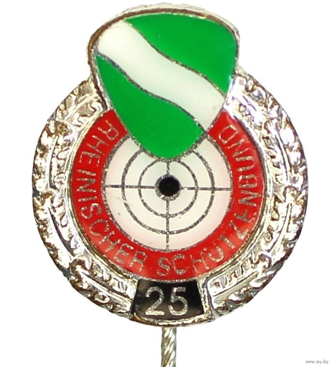 Значок Rheinischer Schutzenbund, Рейнского стрелкового союза земли Вюртемберг. Число "25" в нижней части, вероятно, указывает на годовщину, членство или спортивное достижение.