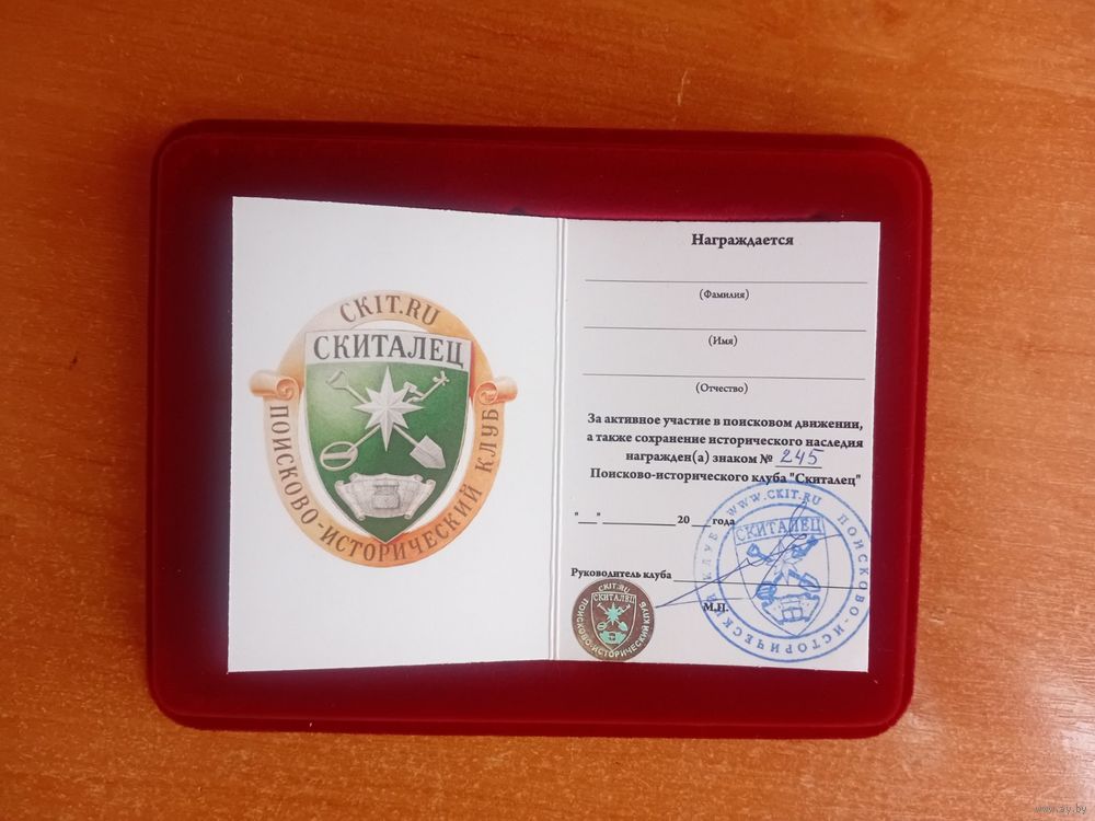 Знак значек Питерского клуба кладоискателей "Скиталец" с удостоверением, в подарочной упаковке