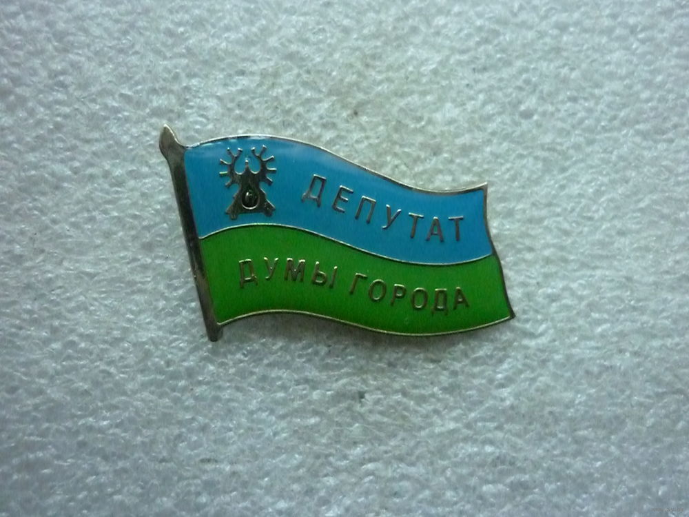 Знак лацканный. Депутат Думы города. Урай ХМАО-Югра. Герб флаг. Нейзильбер смола заколка.