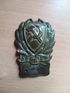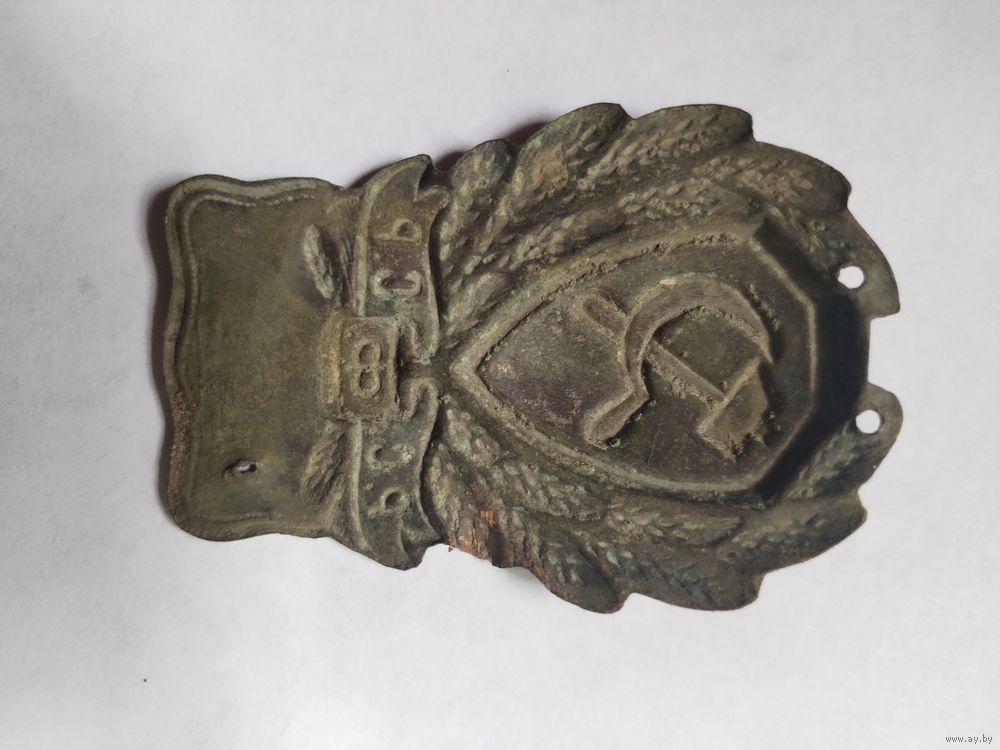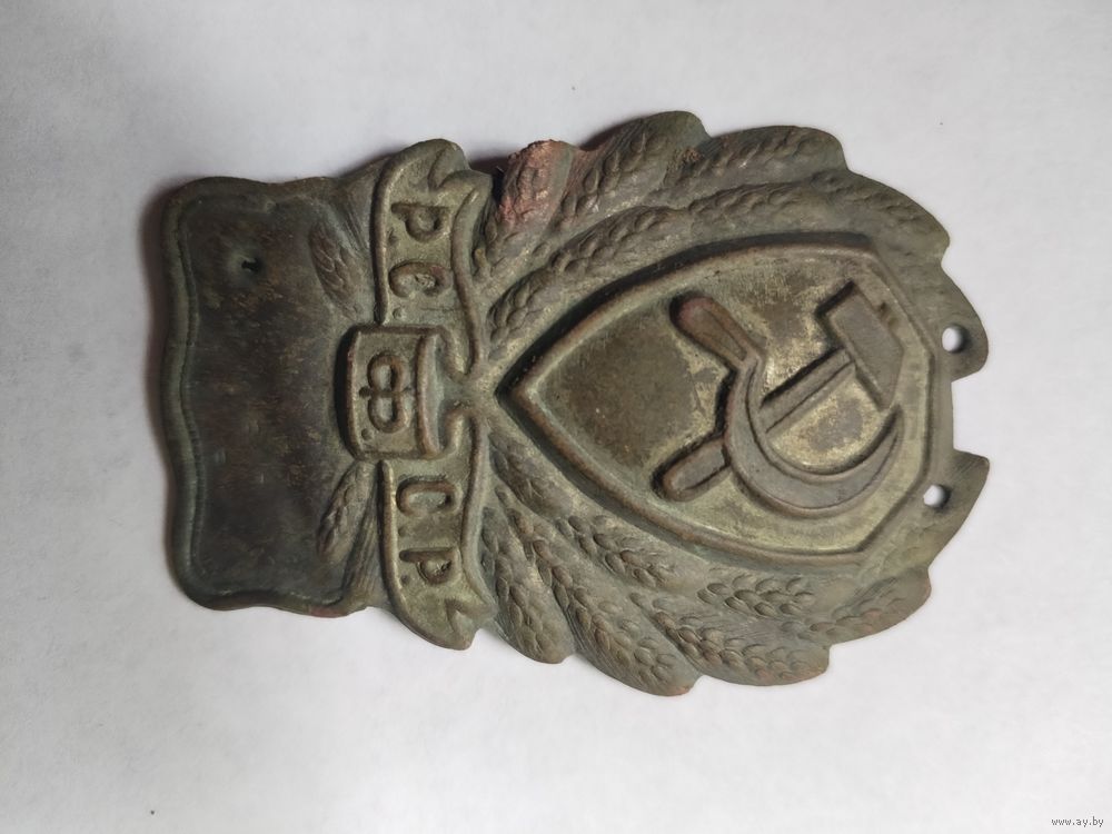 @Сергей:Нагрудный знак милиции РСФСР 1924 года представляет собой овальную металлическую бляху белого цвета с щитом красного цвета в центре, на котором изображены перекрещенные серебристый серп и молот. По кругу щита расположен венок из колосьев, а под ним — красная лента с буквами «РСФСР». В нижней части знака располагается пластина для выбивания личного номера сотрудника.