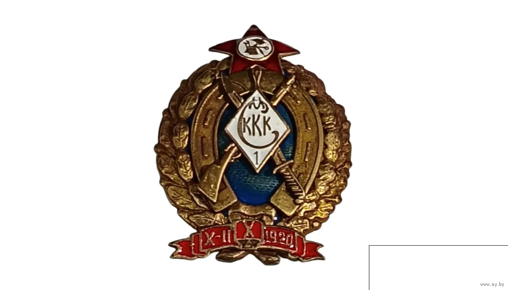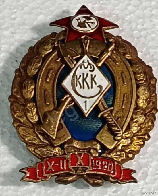 Знак об окончании 1-ых Московских Советских кавалерийских курсов командного состава. Редкий неописанный знак первых лет Советской власти. Об окончании этих курсов упоминает в своих воспоминаниях Михаил Иванович Марьин. Марьин М.И. (1897-1987 гг.) - генерал-майор инженерных войск. В 1940 - заместитель начальника Инженерного управления, в 1941 - начальник Управления снабжения инженерных войск, в 1942- начальник штаба инженерных войск Волховского фронта, в 1942 - начальник инженерных войск 2-й Ударной армии Волховского фронта, в 1946 (?)-начальник Научного института инженерных войск.