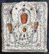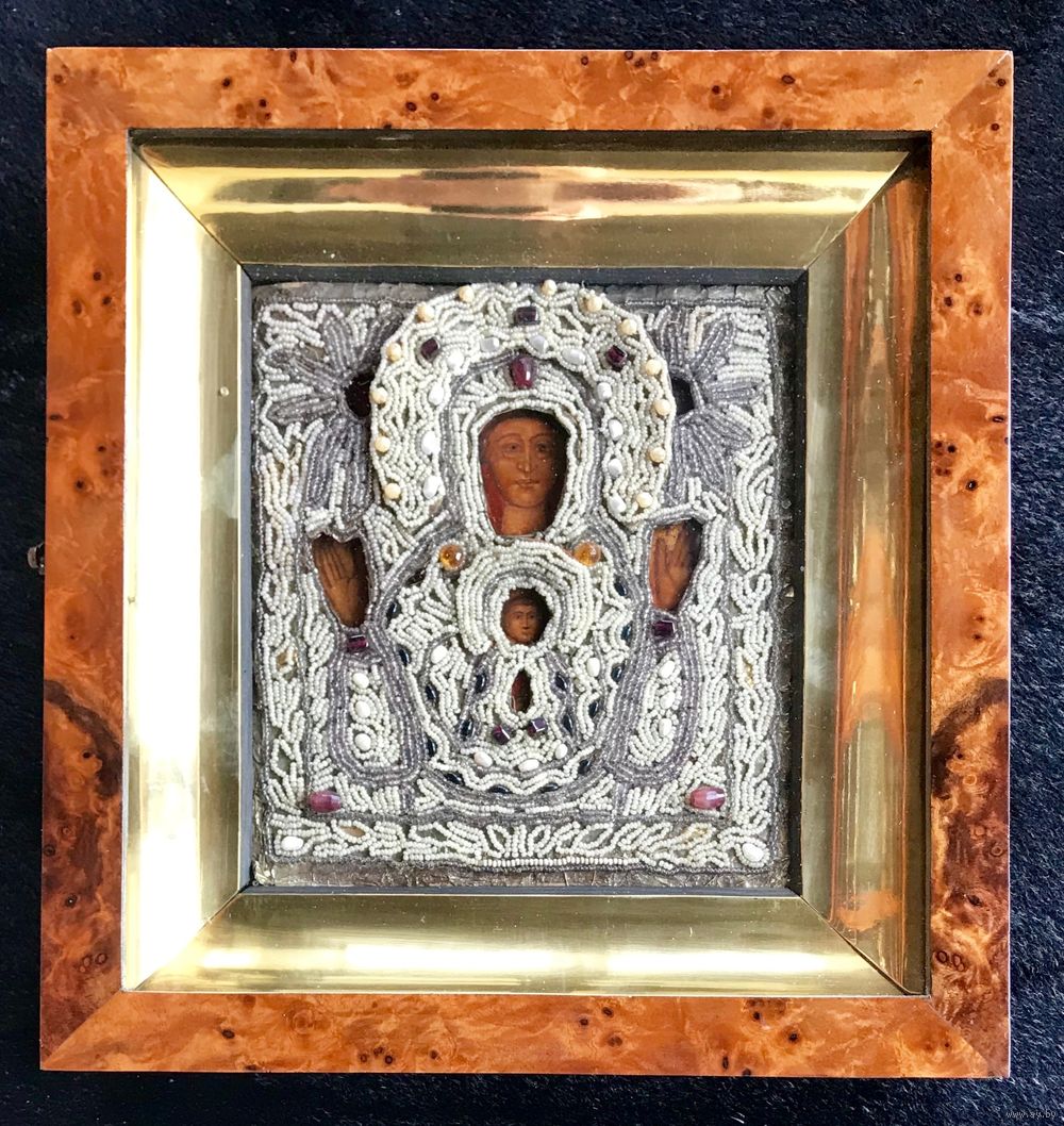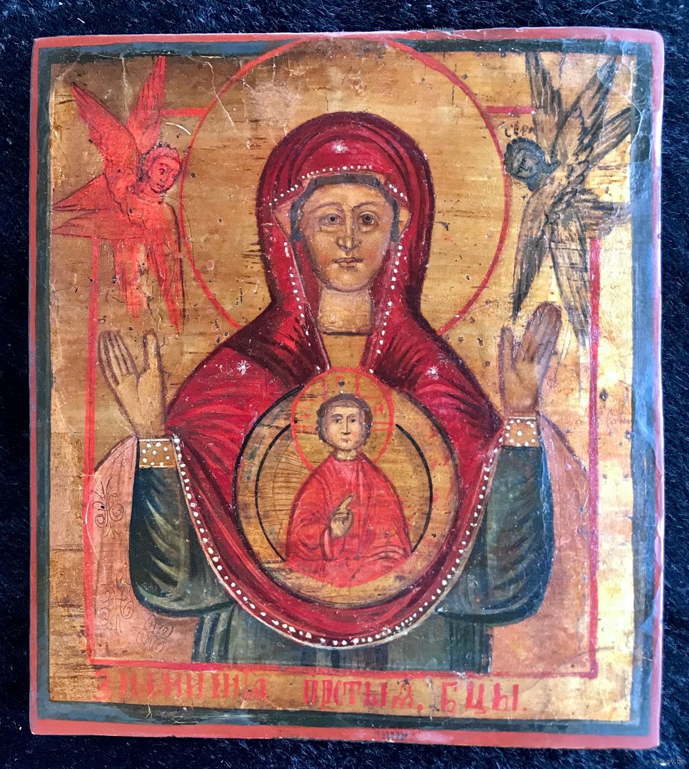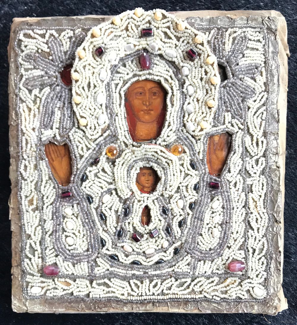 икона Божьей Матери "Знамение". Ветка, XIX век. Шитьё. Размер 18×20 см, в киоте 30×32 см.