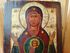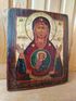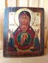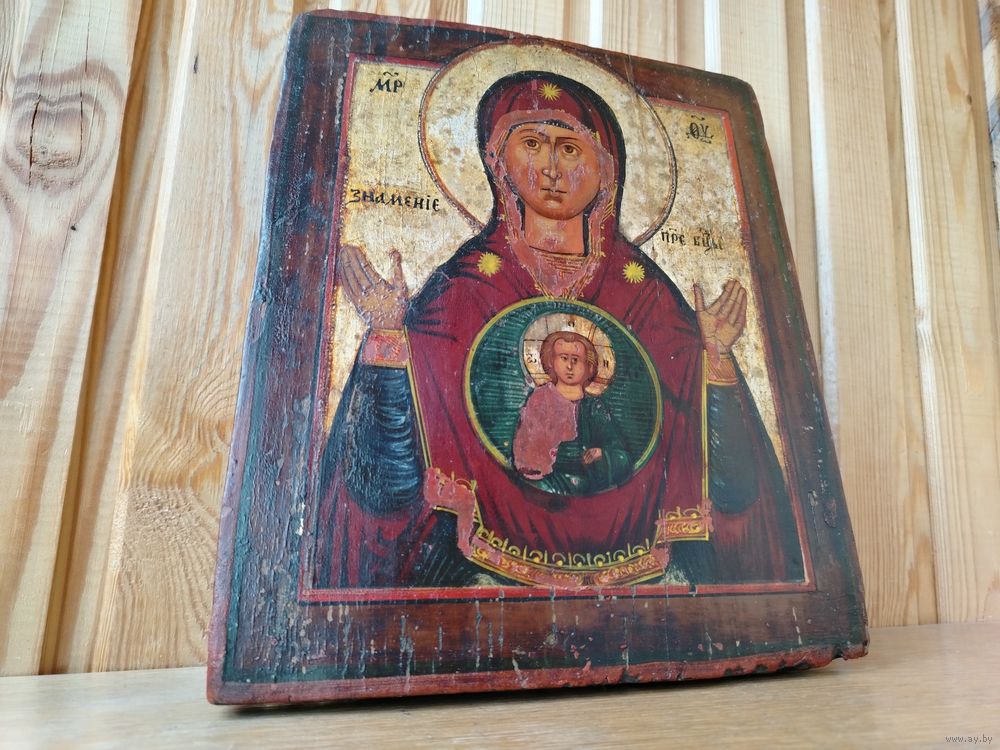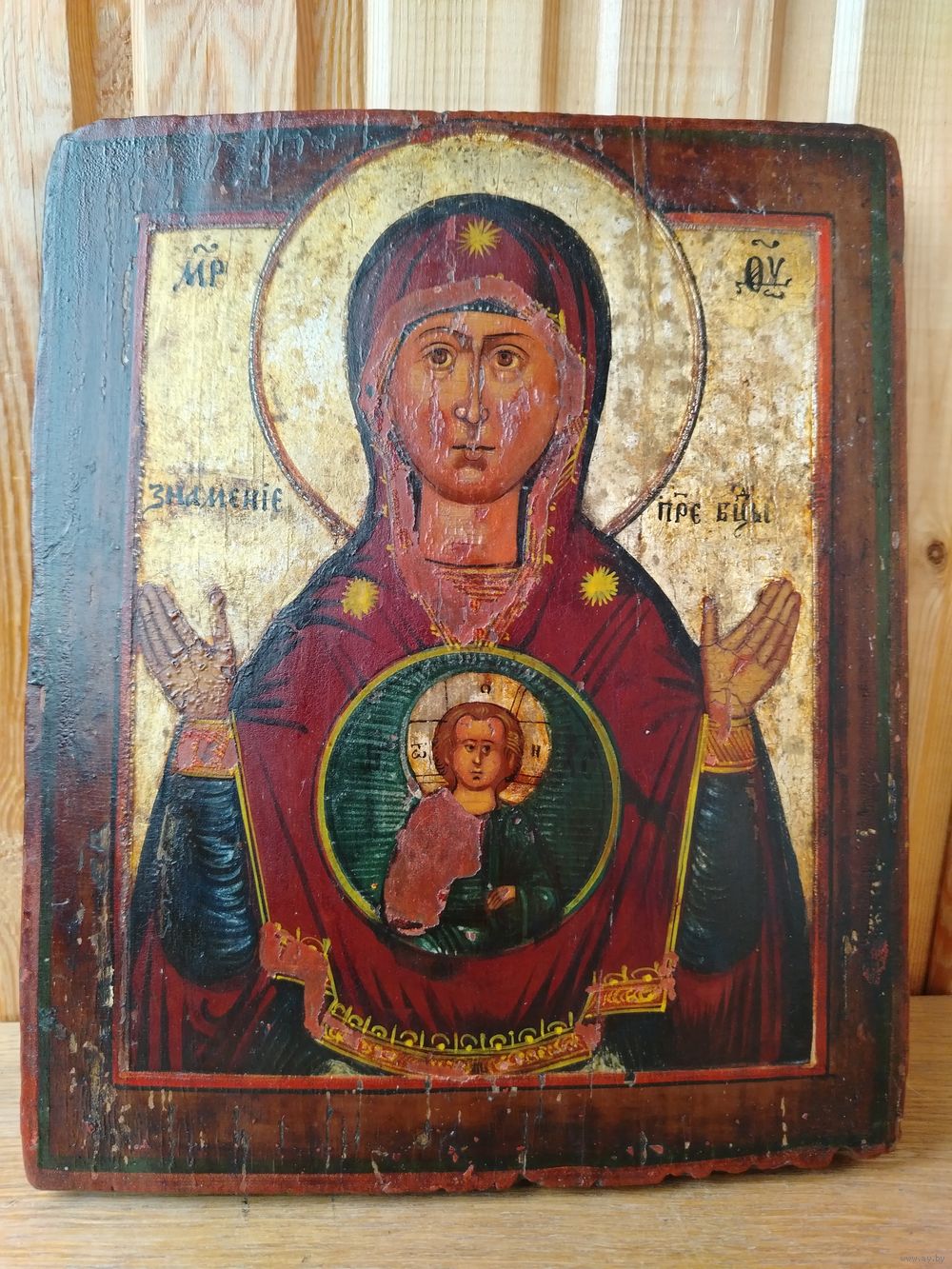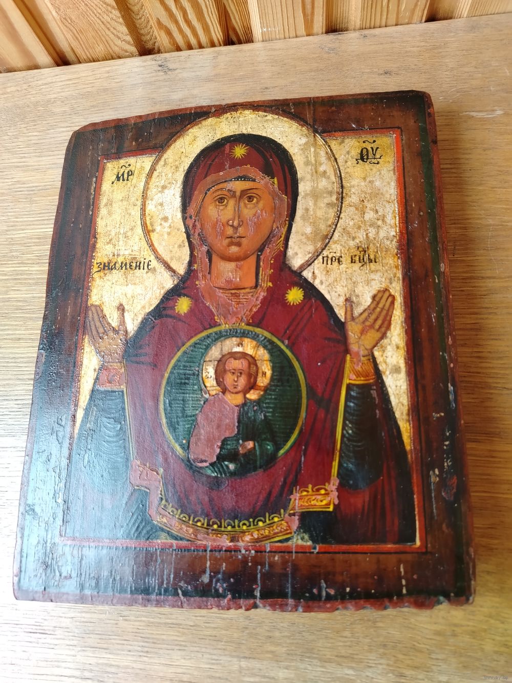 Продаётся антикварная икона "Знамение Пресвятой Богородицы" — уникальный духовный и художественный артефакт XIX века. Это старинная рукописная икона, выполненная на деревянной доске.