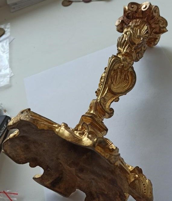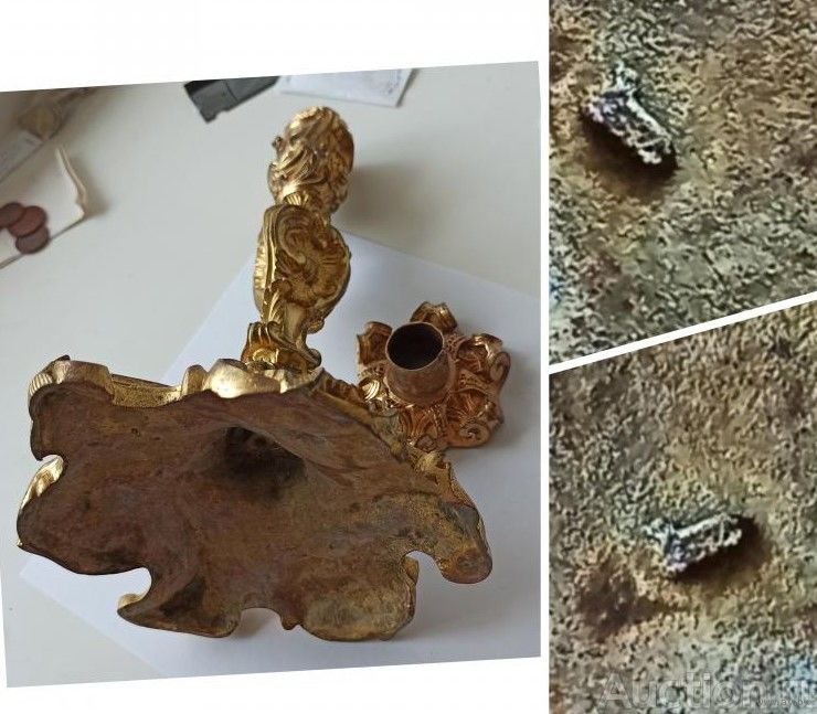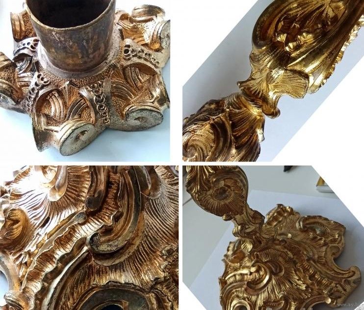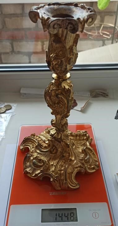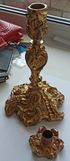 Золочёный антикварный царский подсвечник из личной коллекции, очень красивый, достойный экземпляр. Золочение оригинальное, есть клеймо, на фото и так особенно рассмотреть сложно, что указано... Основной металл бронза или латунь, покрытие - настоящее золото. Верхняя чашечка снимается, на внутреннем полом штоке, который вставляется внутрь подсвечника, есть трещина (на технические свойства и красоту никак не влияет, так как шток утопляется во внутрь). Подсвечник тяжёлый, без малого 1,5 кг. Приобретался давно, как подсвечник из дворца. Из личных вещей одного поэта...