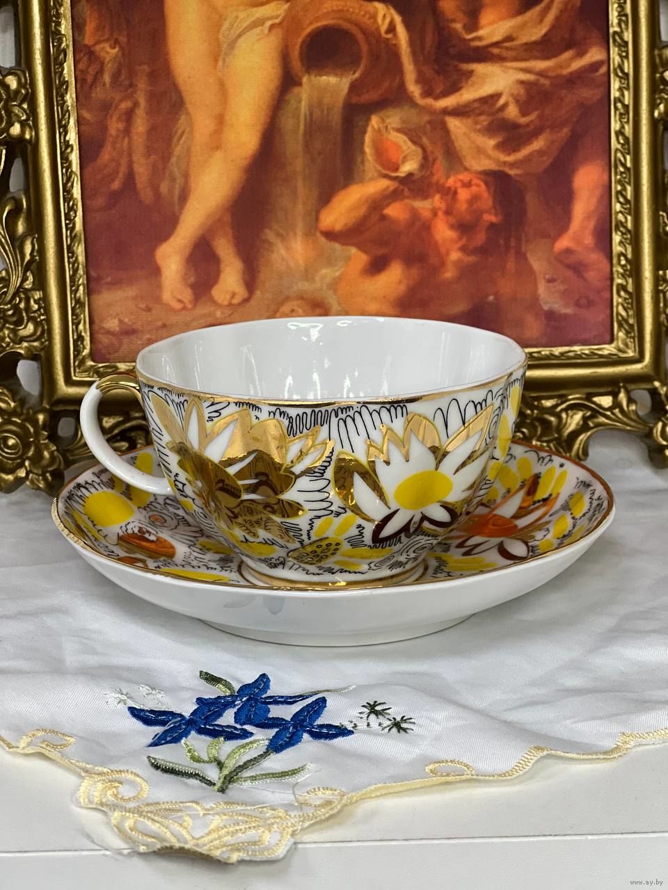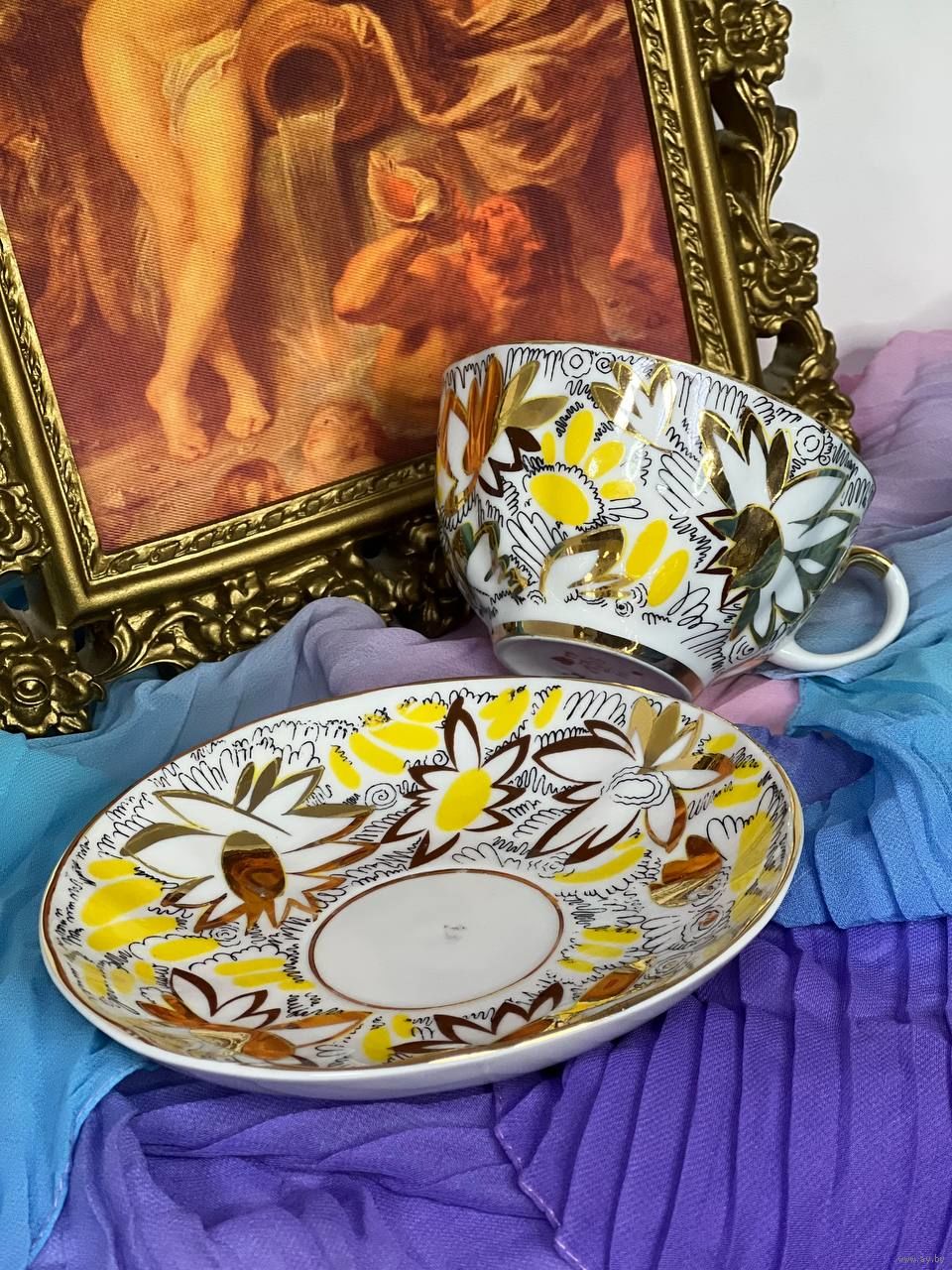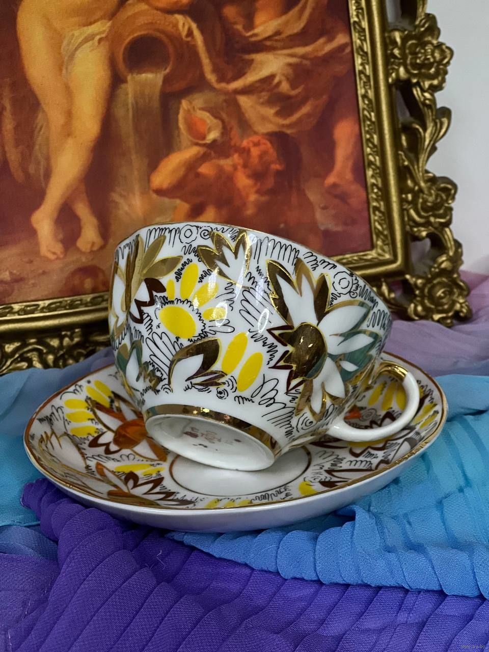 Чайная пара из сервиза Золотая ромашка. Все целое без сколов и трещин. Есть незначительные потёртости позолоты.