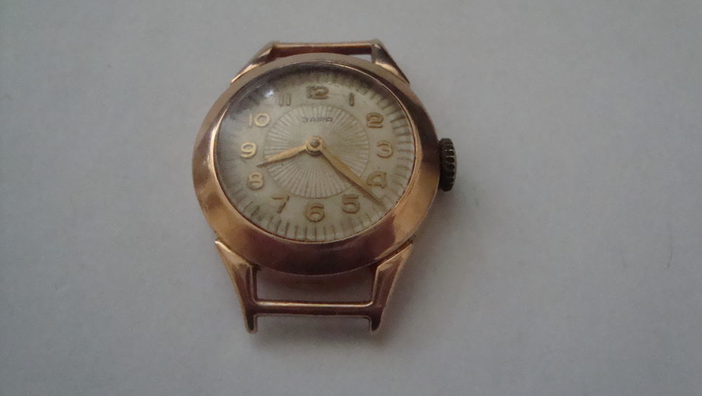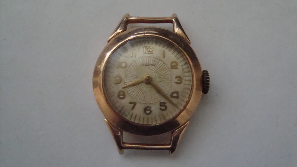 Золотые часы Заря, проба 583, не на ходу, общий вес 11.1 гр.. вес корпуса отдельно не знаю, вскрывать и разбирать не буду. Головка наверно не родная, в позолоте, обтёрлась. Пружина заводится, при потряхивании слышен стук, вероятно сломан маятник. Интересующие вопросы в обсуждении аукциона, viber, WhatsApp, Telegramm, можно звонить. Если требуется - сделаю дополнительные фото. На предложения по торгу не отвечаю.