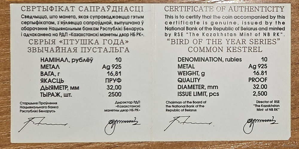 Звычайная пустальга (Обыкновенная пустельга). Сертификат. 10 рублей 2010г.