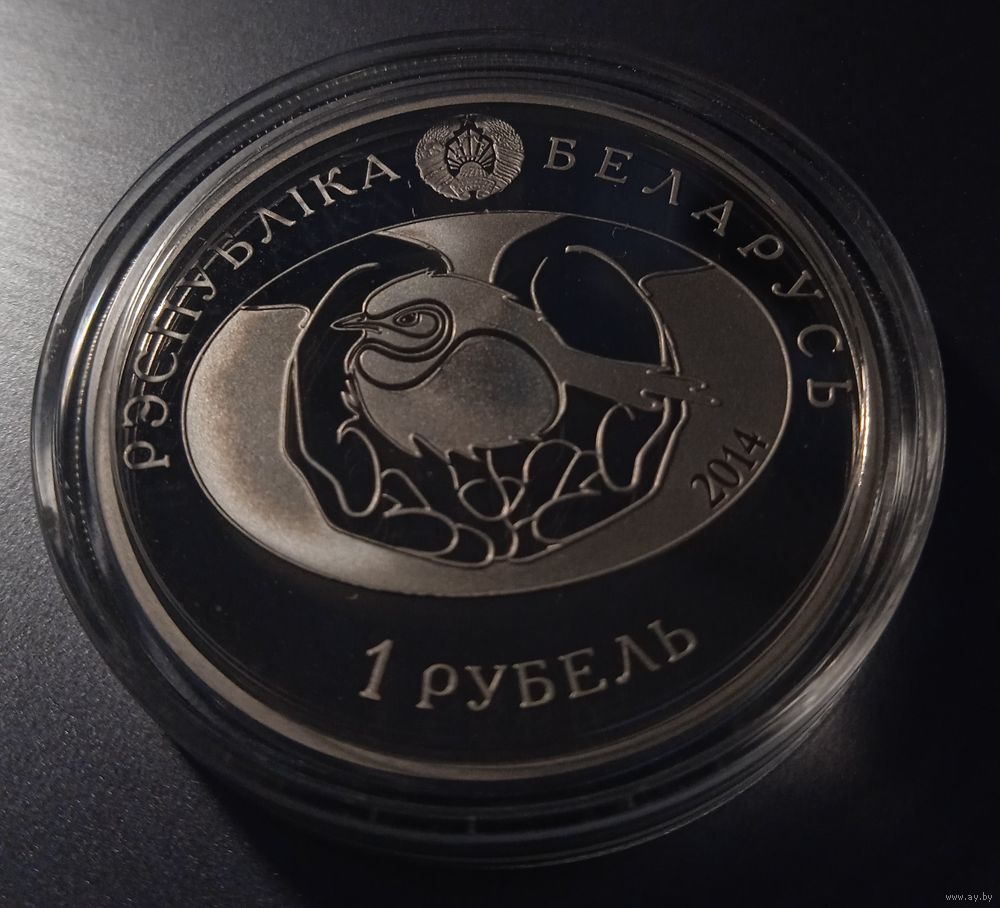 вверху – рельефное изображение Государственного герба Республики Беларусь, по кругу надпись: РЭСПУБЛІКА БЕЛАРУСЬ; в центре – изображение маленькой птички на ладонях, под ним справа – год чеканки; внизу – номинал: 1 РУБЕЛЬ (на медно-никелевой).