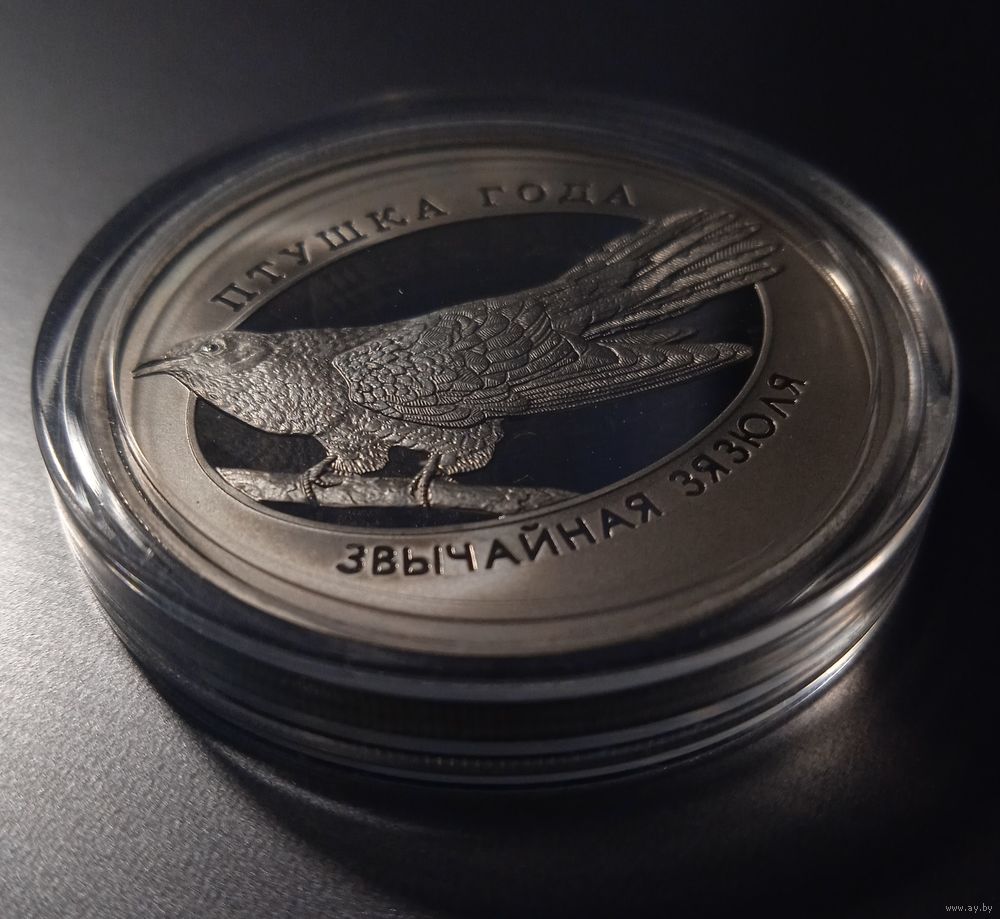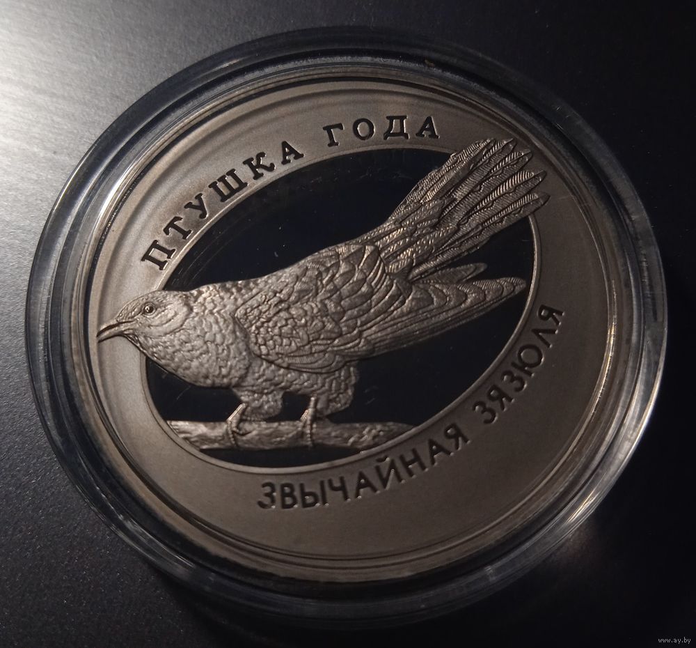 в центре – рельефное изображение кукушки (она признана в Беларуси в 2014 году Птицей года); по кругу надписи: вверху – ПТУШКА ГОДА, внизу – ЗВЫЧАЙНАЯ ЗЯЗЮЛЯ.